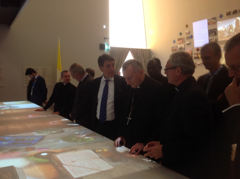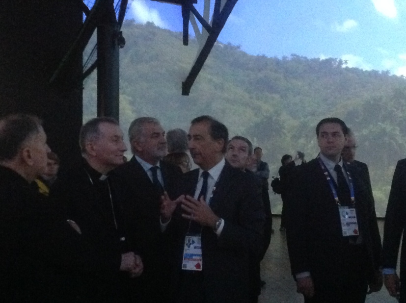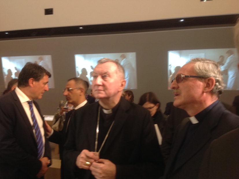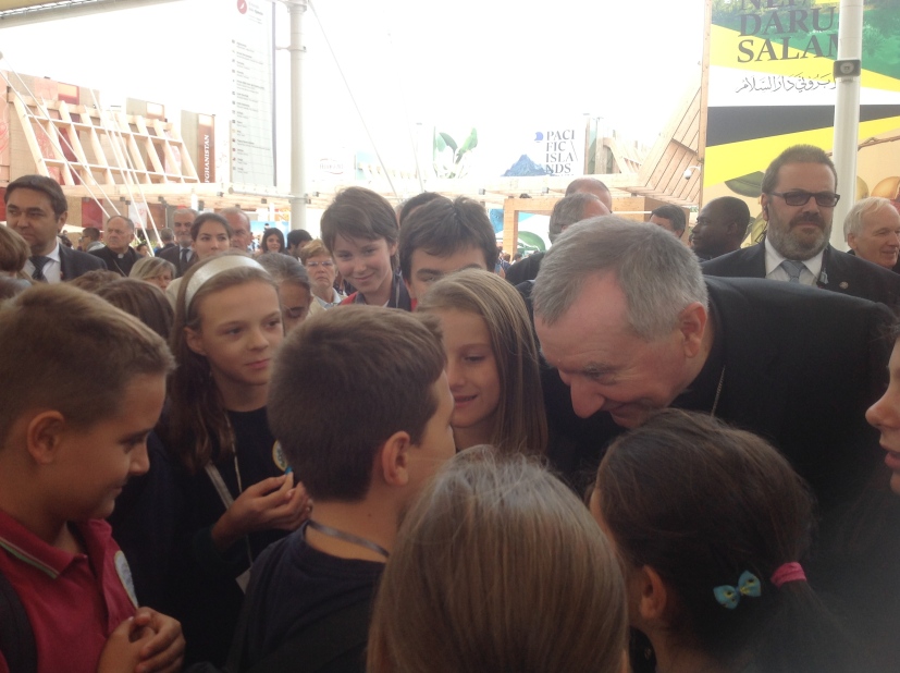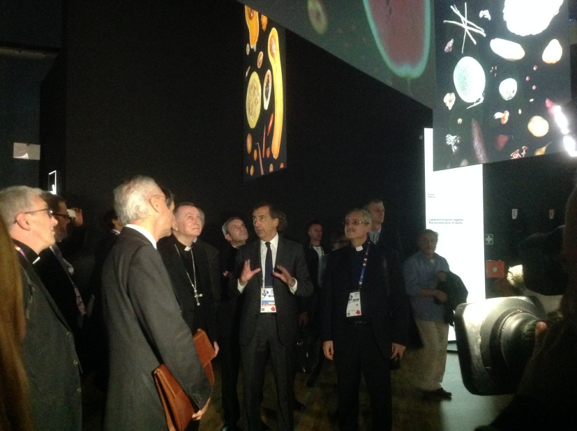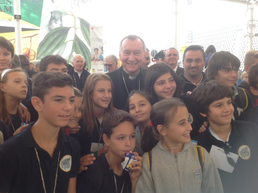 La giornata di Parolin a Expo è iniziata con una visita prolungata al Padiglione Italia, fatta di numerose osservazioni, richieste di chiarimenti e apprezzamenti. Il Cardinale è stato accolto da Graziano Delrio, ministro delle infrastrutture e dei trasporti. Con lui ha visitato Palazzo Italia, accompagnato da una delegazione comprendente monsignor Pasquale Iacobone e Luciano Gualzetti (vicecommissari del Padiglione della Santa Sede), monsignor Erminio De Scalzi (delegato della Diocesi di Milano per i grandi eventi), monsignor Mario Lusek (direttore dell’Ufficio Nazionale per la pastorale del tempo libero, turismo e sport della Cei), monsignor Luca Bressan (presidente di Caritas ambrosiana e vicario episcopale per la cultura, la carità, la missione e l’azione sociale della Diocesi di Milano), Livio Gualerzi (dirigente per i progetti speciali della Cei), Stefano Gatti (direttore generale di Padiglione Italia) e Fabrizio Grillo (segretario generale di Padiglione Italia). Il cardinale Parolin si è tra l’altro soffermato in prossimità dell’angolo dedicato ai bambini, dove una guida stava spiegando a una scolaresca il significato del “cibo spazzatura” e il valore di una dieta equilibrata che, se possibile, valorizzi i prodotti del territorio.