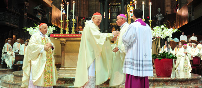E come in ogni occasione di festa, non poteva mancare un regalo, segno di riconoscenza a mons. Redaelli, che al termine della celebrazione gli ha consegnato lo stesso arcivescovo Scola. Un dono che conferma «la poca fantasia» della Chiesa di Milano, ha scherzato monsignor Mario Delpini, nuovo Vicario generale e successore di monsignor Redaelli. Pensando alla destinazione, Gorizia, «là dove soffia il vento di Scandinavia e la bora, avremmo potuto regalare qualche pezzetto del cielo di Lombardia». Oppure, pensando che mons. Redaelli celebrerà in rito romano, si sarebbe potuto donargli «una riproduzione del Codice di Busto, punto di riferimento indispensabile per il nostro rito ambrosiano, perchè continui a ricordare le ricchezze della nostra tradizione». E, ancora, sapendo che a Gorizia esistono tre lingue ufficiali, si poteva regalare «qualche letteratura del dialetto milanese, perchè non dimentichi le sue origini e la sua presenza a Milano». E invece, alla fine, ha concluso mons. Delpini, «gli abbiamo regalato un ipad, per lavorare in ufficio e a casa, in treno e in piazza…». È un regalo che diventa un «imperativo» e come a dirgli: «Lavora, lavora, lavora». Un applauso scrosciante si è alzato dalle navate del Duomo, mentre il clima della solenne celebrazione, si scioglieva nel sorriso di migliaia di fedeli.