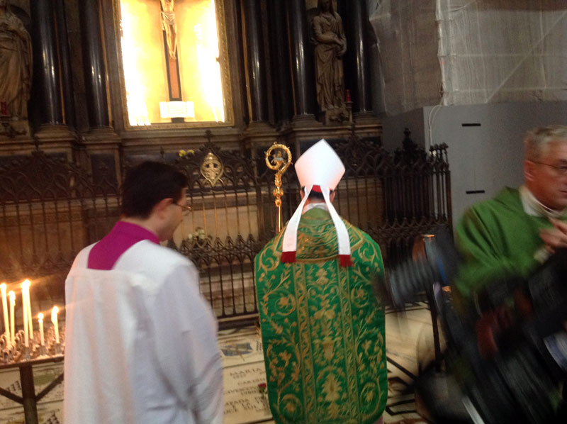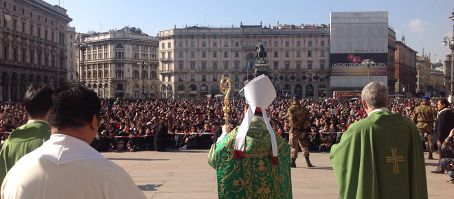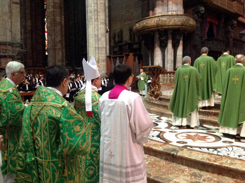 Infine, dopo la processione tra due ali di folla nella navata maggiore, la benedizione alle migliaia che lo attendono in piazza, con un “buongiorno e buon pranzo”, che fa sentire un poco in piazza San Pietro. La folla sembra non voler lasciare il proprio illustre compatriota, che rientrato in un Duomo silenzioso e dai colori bellissimi attraverso la luce radiosa delle vetrate, sosta brevemente in preghiera presso la tomba del cardinale Martini, prima di rendere omaggio a San Carlo, scendendo nello Scurolo.