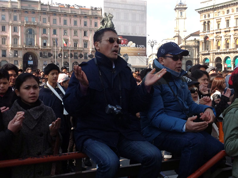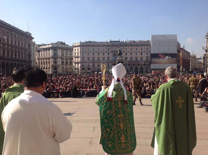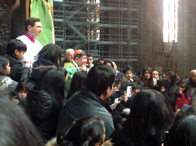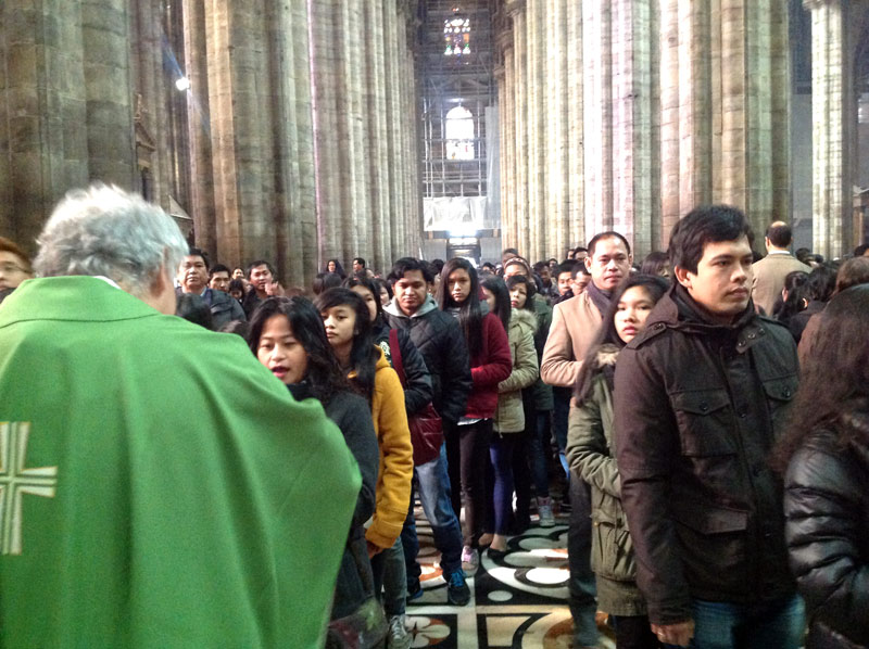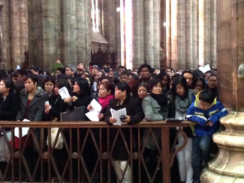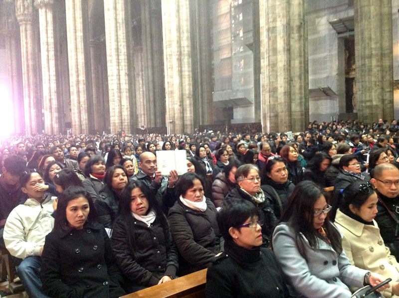 Ventimila persone e un’attesa, in Duomo e sulla piazza, che inizia già di prima mattina, divenendo vero e proprio entusiasmo quando alle 11.00 in punto il cardinale Luis Antonio Tagle, arcivescovo di Manila, attraversa in processione, preceduto dagli striscioni delle singole comunità filippine diocesane e lombarde e accompagnato da oltre quaranta sacerdoti, le navate del Duomo.
