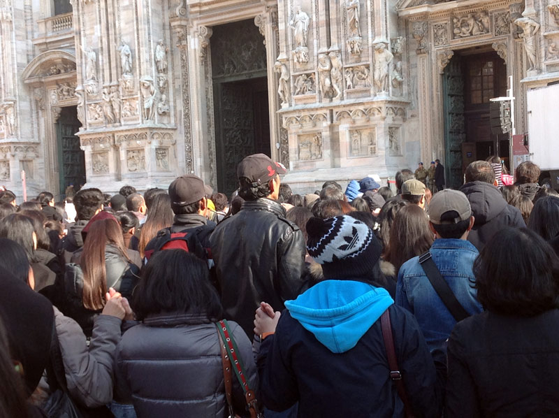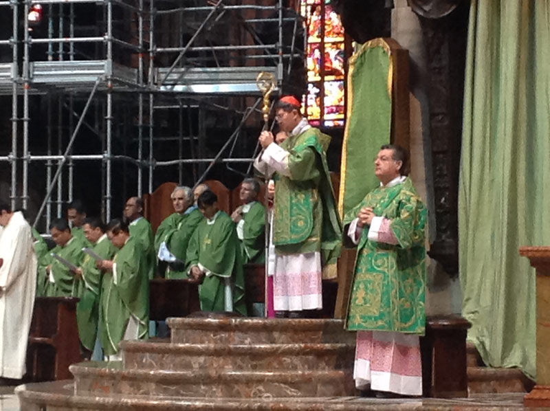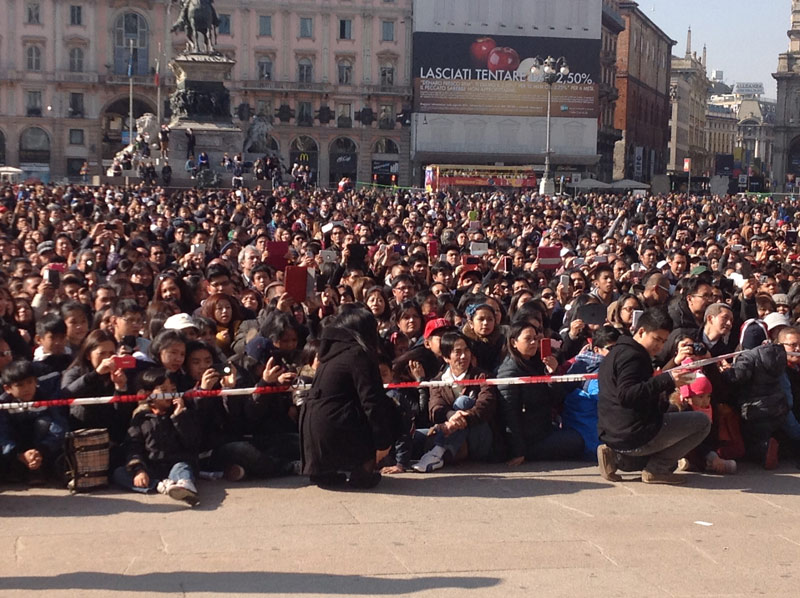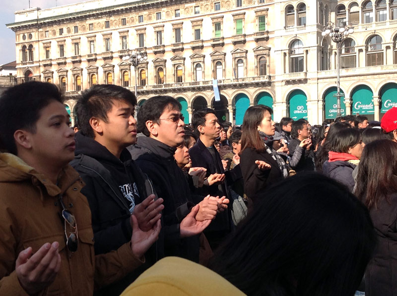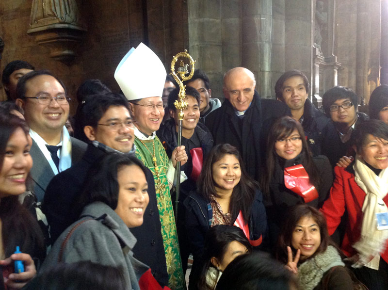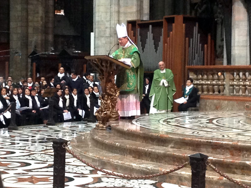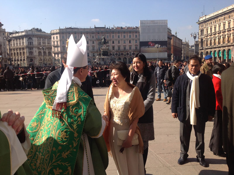 Ventimila persone e un’attesa, in Duomo e sulla piazza, che inizia già di prima mattina, divenendo vero e proprio entusiasmo quando alle 11.00 in punto il cardinale Luis Antonio Tagle, arcivescovo di Manila, attraversa in processione, preceduto dagli striscioni delle singole comunità filippine diocesane e lombarde e accompagnato da oltre quaranta sacerdoti, le navate del Duomo.