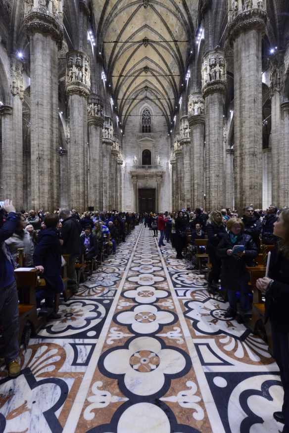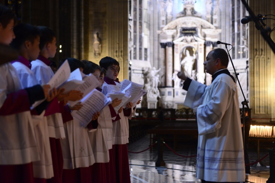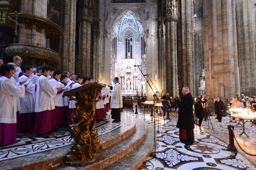 E così, finalmente, tutti con il naso all’insù, per vedere il prodigio di una Cattedrale che illuminandosi, pare trasformarsi, animarsi, prendere movimento, mentre la Cappella Musicale  esegue il Lux fulgebit hodie super nos e altri canti liturgici della Luce. Il Padre Nostro, che il Cardinale invita a cantare insieme, ha il senso della consolazione nel Signore per un popolo riunito sotto una “tenda” unica al mondo. Tenda della fede e delle meraviglie, tra i particolari delle statue poste alla sommità dei grandi pilastri, ammirabili ormai, per intero, e il gioco di luci e ombre che si intesse sul bianco chiarissimo del marmo restaurato. Con tante sorprese come la decorazione delle volte che coprono le navate laterali, che non è scolpita, ma solo dipinta con fregi che imitano quelli di esterni dell’architettura marmorea. Ora lo si vede bene.