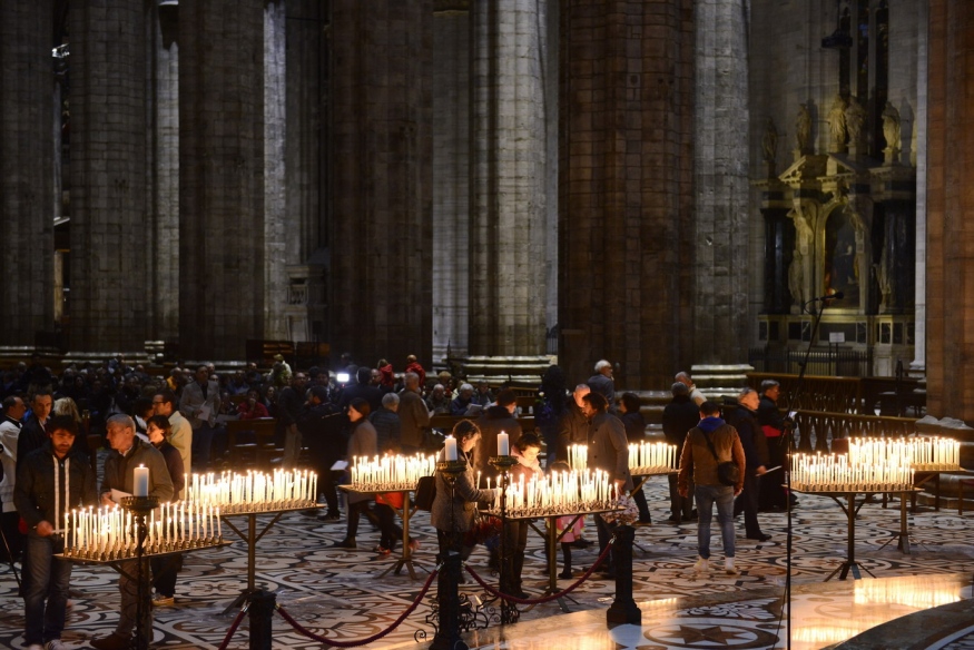 Sono le nove di sera in punto quando tanti cittadini iniziano a entrare nel Duomo in penombra per accendere ciascuno la propria candela. Una luce esile nella Cattedrale che pare ancora più grande e maestosa nel silenzio e nell’oscurità che la avvolge. Eppure, appena dopo pochi minuti, il chiarore e il calore delle fiammelle che sono divenute già 1152 – quante ne possono contenere i dodici, tradizionali, portacandele posti ai piedi dell’altare maggiore –, sono il segno palpabile della chiesa che vive.