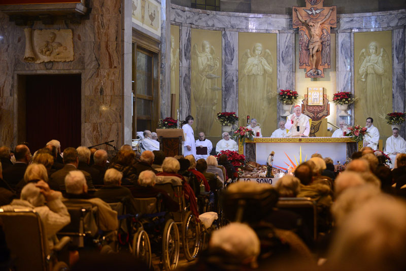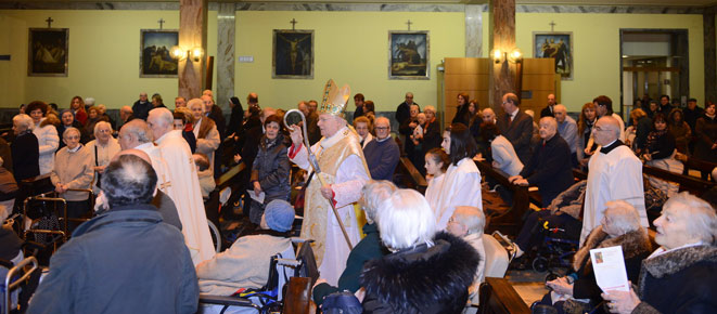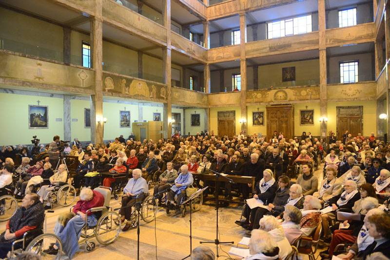 Su molte file, ai piedi dell’altare maggiore, decine di anziani in carrozzina, che con gli altri malati, i medici, le Suore delle Poverelle che svolgono la loro assistenza fin dagli inizi della Casa, le Suore della Carità, che da qualche anno le affiancano, il personale, i parenti – è presente anche l’assessore alla Coesione sociale del Comune, Granelli – affollano la tipica e accogliente struttura anni Trenta della Chiesa, da poco arricchita di due altorilievi rappresentanti don Gnocchi, donati da don Livio Aretusi, cappellano del “Palazzolo” per otto anni, scomparso ad agosto. Un simbolo di attenzione alle persona, come il coro costituito da venticinque degenti: «È un segno bello della creatività di questo luogo, capace di coniugare intelligenza e amore», osserva Scola.
