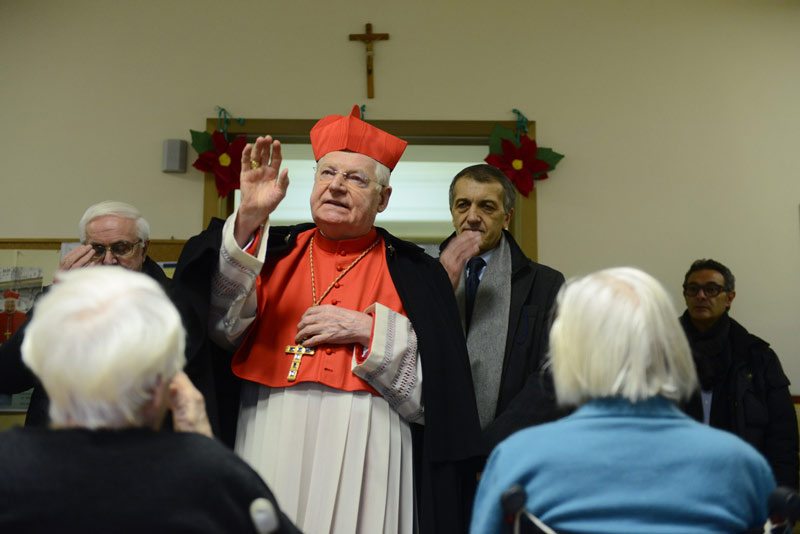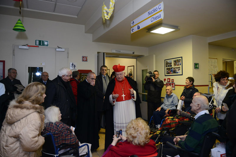 Il Cardinale visita, nell’ultima domenica dell’Avvento, l’Istituto Palazzolo, come tradizione fin dai tempi del cardinale Martini. Tanti i degenti anziani che lo salutano e pregano brevemente con lui che si avvicina a molti di loro, percorrendo i lunghi corridoi verso la grande Chiesa interna alla struttura. Per tutti c’e una parola buona, un battuta scherzosa, un incoraggiamento, magari in un momento di particolare difficoltà, il segno della croce e una speciale benedizione. Il clima, anche se fuori la nebbia e la pioggia rendono tutto grigio, è caldo, quasi intimo, nonostante i grandi numeri del “Palazzolo”, clima davvero natalizio: ovunque, nei singoli reparti, ci sono piccoli presepi e le decorazioni, come nota il direttore del “Polo Lombardia 2”, Maurizio Ripamonti che accoglie il Cardinale con monsignor Angelo Bazzari, presidente della Fondazione don Gnocchi, cui l’Istituto fa capo dal 1998. Molti sono anche i sacerdoti, dal Moderator Curiae, monsignor Bruno Marinoni al vicario episcopale di settore, monsignor Luca Bressan, al decano del Decanato Cagnola monsignor Carlo Azzimonti, fino ai cappellani. Poco dopo, concelebrano tutti insieme anche a due dei sei sacerdoti qui ricoverati, con il Cardinale, nella Cappellania Sacro Cuore di Gesù dove don Enzo Rasi, cappellano dal 2011, dà il benvenuto.