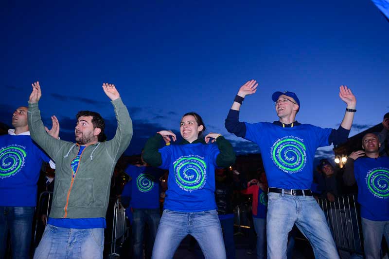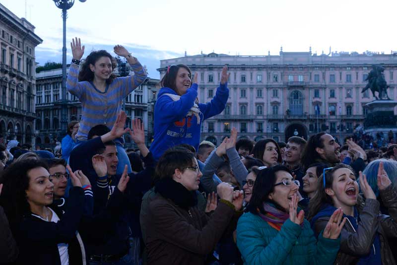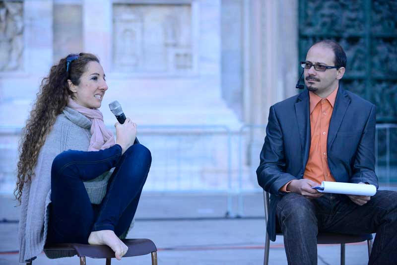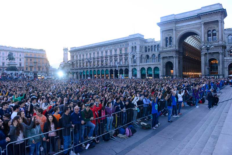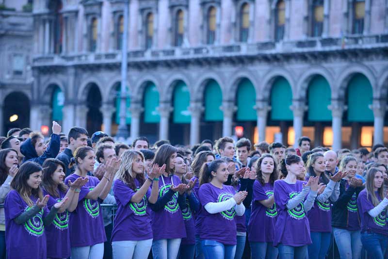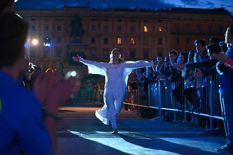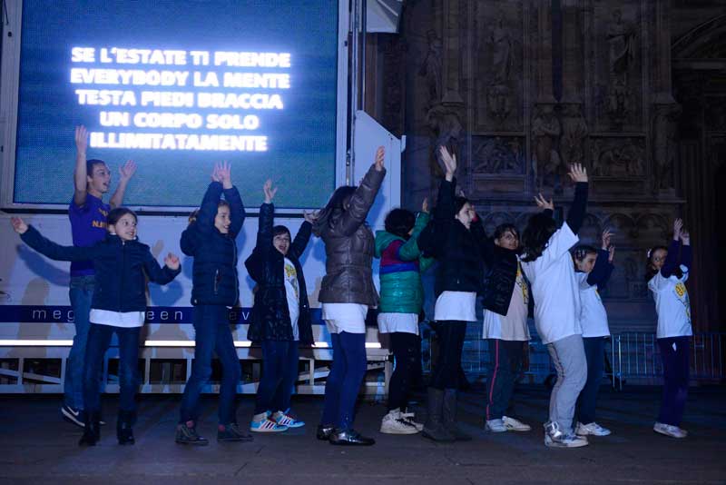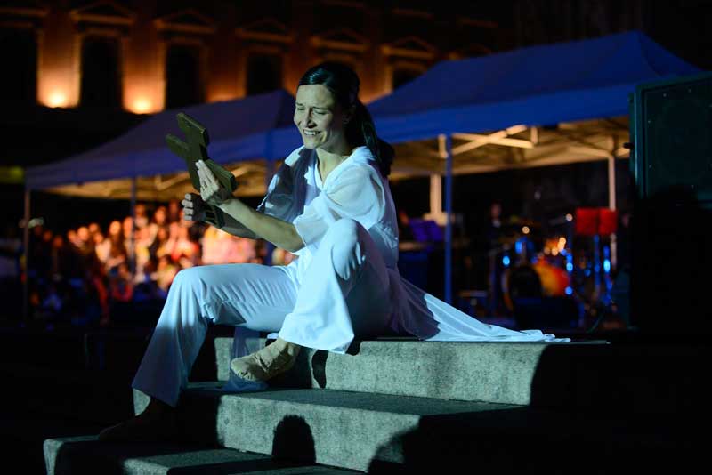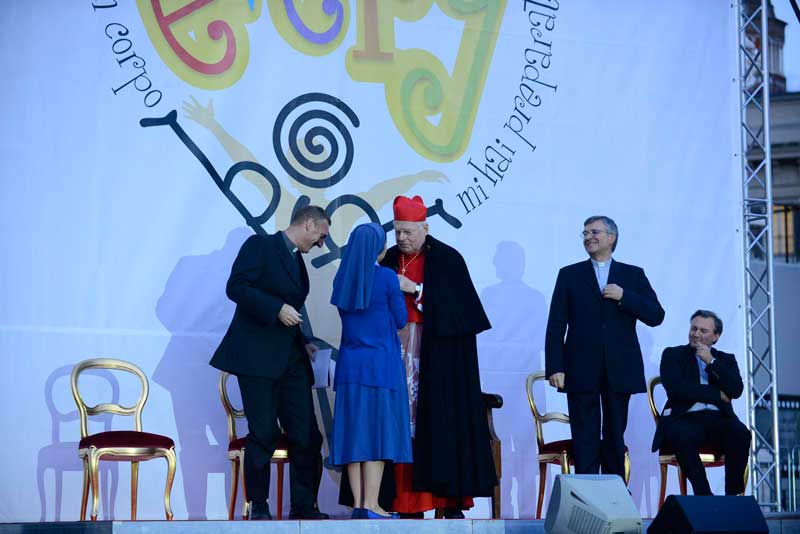 Dopo la preghiera in Duomo tutti sono usciti nella piazza, e lì è cominciata la grande festa insieme. Prima la colonna sonora dell’Oratorio estivo 2013 alla presenza dell’Arcivescovo, dal titolo “Every body”, e poi i contributi di due ospiti d’eccezione: suor Anna Nobili, che ha realizzato una scuola di danza moderna in cui il ballo fosse espressione di fede, e Simona Atzori, che non si è arresa alla sua disabilità e con il solo utilizzo dei piedi è diventata una affermata artista nel campo della pittura, della scrittura e della danza.
