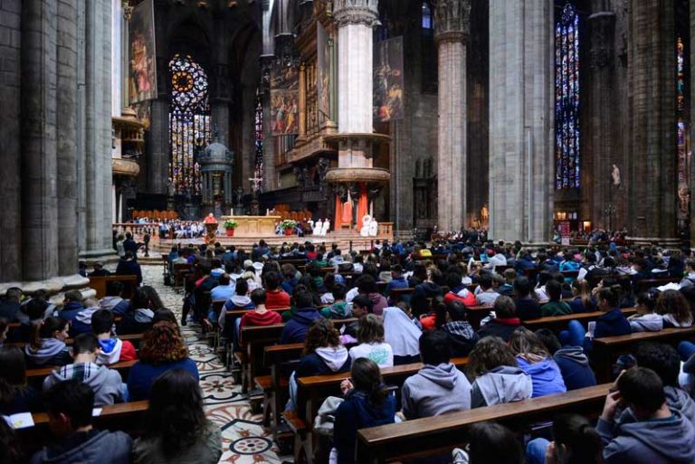 Dopo un pomeriggio graziato dalla pioggia e passato agli stand allestiti nel centro della città, i giovani animatori sono confluiti in Duomo per ascoltare le parole del Cardinale.