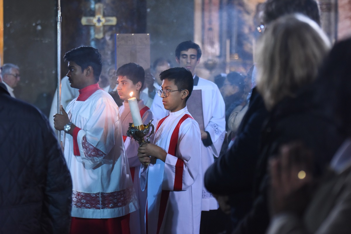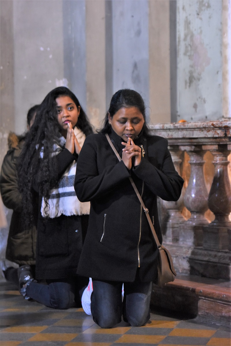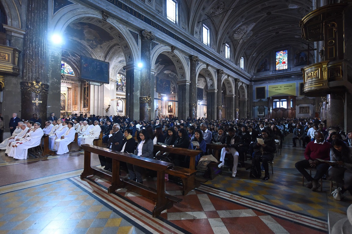 In Santo Stefano, che si affolla già molto prima dell’inizio della Messa, ci sono oltre 1000 fedeli, molti in piedi fino alle porte, per la maggioranza appartenenti alle Comunità dello Sri Lanka, ma anche di altre Cappellanie straniere che, invitate, non mancano a questo momento di preghiera celebrato in più lingue. Tra le navate, risuonano i canti del Coro srilankese, mentre ai lati dell’altare maggiore lo stendardo della comunità di Milano, “Our Lady of Lanka”, è posto accanto alla piccola statua del Cristo risorto normalmente offerto alla devozione nelle loro parrocchie. Quasi un’immagine vivente dell’unica Chiesa dalle Genti.