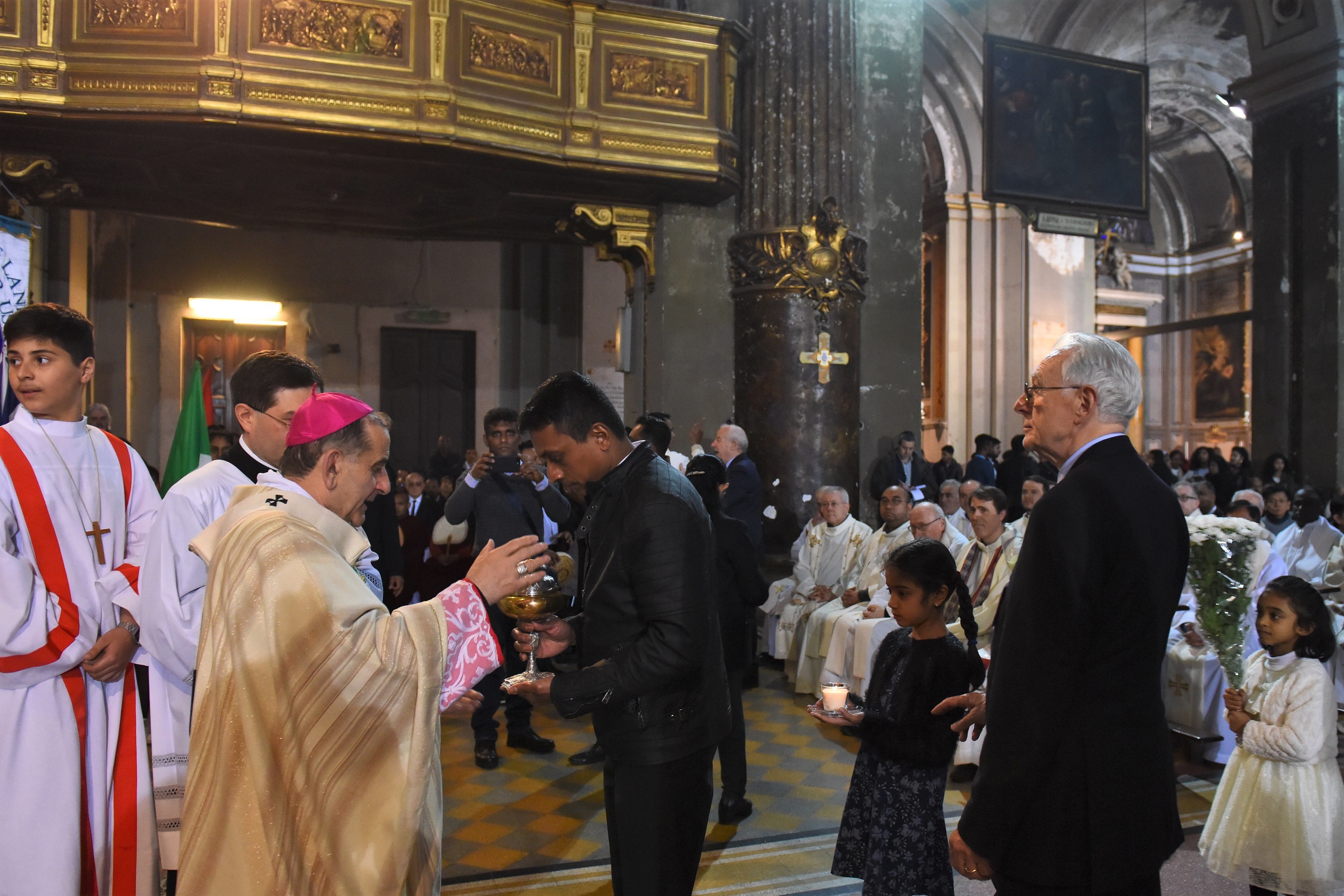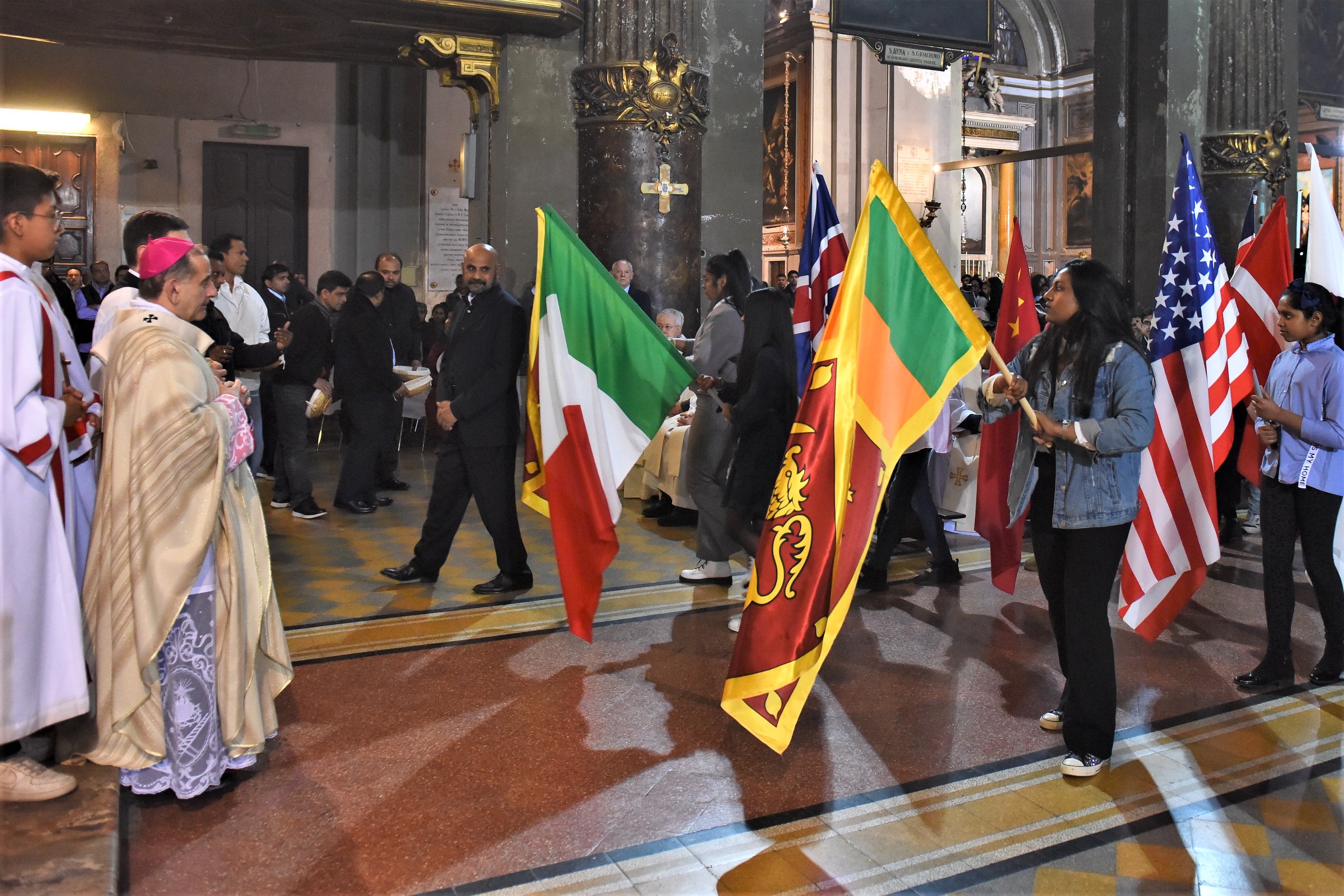 Poi, all’offertorio, accompagnati dal canto della tradizione srilankese di “offerta del dolore di Cristo”, i più piccoli – moltissime le famiglie giovani e i bambini presenti – portano i doni e le bandiere di tante nazioni, mentre un gran numero di fedeli lasciano all’altare una semplice busta bianca contenete le offerte per le vittime degli atti terroristici. Si prega anche per il perdono di chi li ha compiuti.