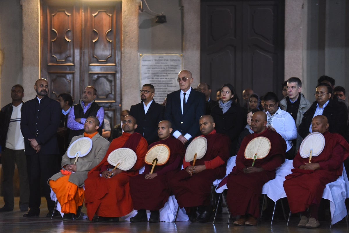 Concelebrano il vicario episcopale di Settore, don Mario Antonelli, altri vicari anche di Zona, tra cui monsignor Mario Azzimonti, per la Città di Milano, il responsabile dell’Ufficio per la Pastorale dei Migranti, don Alberto Vitali, unitamente a una ventina di sacerdoti e ai 3 Cappellani della comunità colpita. A lato dell’altare siedono 6 monaci buddisti che portano, in preghiera silenziosa, la solidarietà della loro fede, la più diffusa nello Sri Lanka. Non manca il console generale del Paese in lutto, Denzil Fonseka.