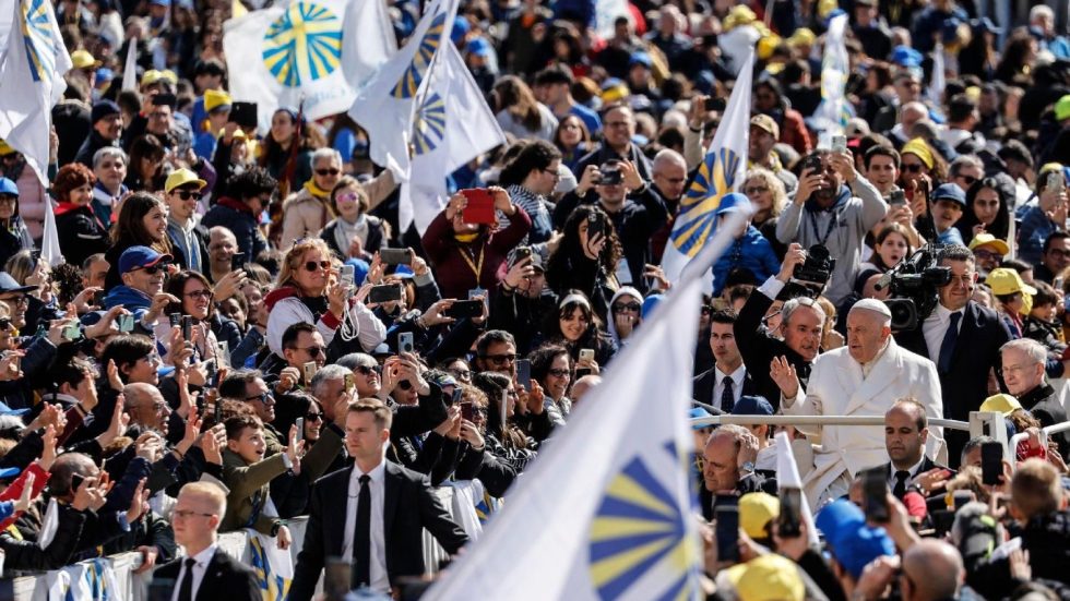 «Poco fa, passando in mezzo a voi, ho incrociato sguardi pieni di gioia e pieni di speranza. Grazie per questo abbraccio così intenso e bello»: così papa Francesco ieri mattina in Piazza San Pietro. Circa 60 mila soci e amici dell’Azione Cattolica Italiana provenienti da tutta Italia sono arrivati qui per incontrarlo, per ascoltare la sua parola e fare festa insieme a lui. Adulti, giovani e ragazzi hanno viaggiato diretti a Roma con oltre 600 pullman, ma anche in treno e con migliaia di auto, con la voglia di costruire un futuro di pace e di speranza, impegnati a essere discepoli e missionari, corresponsabili della costruzione del bene comune. «A braccia aperte», il titolo dell’incontro che vuol esprimere questo camminare insieme valorizzando le diversità e andando incontro agli uomini e alle donne di oggi.