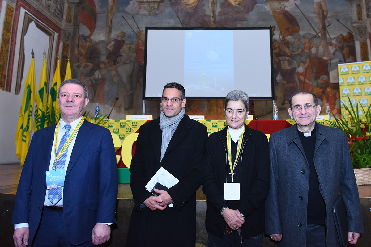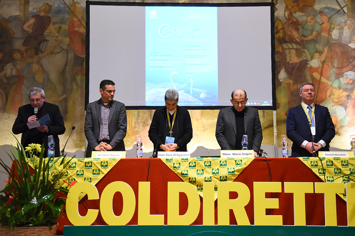 È poi la volta della testimonianza di suor Vera d’Agostino, fondatrice della Comunità delle Figlie dell’Amore di Gesù e Maria che, in 100 ettari di terreno nelle campagne di Chieti, con 70 consorelle che hanno studiato agraria, coltiva e alleva in una fattoria. Donna e religiosa “di polso”, e lo si capisce subito, quando chiarisce: «Sono qui anche in veste di agricoltore. Vengo da una famiglia contadina in cui ho imparato ad amare la terra con la generosità della condivisione. Credo che il terreno dove poggio i piedi sia benedetto da Cristo tutti i giorni e penso che se noi uomini ascoltiamo questa terra, potremmo evitare tanti sbagli. La terra è come l’uomo, è l’uomo: la sentiamo respirare; cammina con noi. È il dono più bello che Dio ci ha dato, non avveleniamola, non facciamola ammalare. Nonostante i nostri maltrattamenti, la terra continua a darci i suoi frutti, ma dice: “Sto soffrendo”. Vorremmo crescere, come iniziativa, soprattutto per i nostri poveri, per i bambini e le famiglie, ma non riesco a trovare nessuno che ci aiuti, anche se è in costruzione una nuova fattoria, grazie proprio al sostegno di Coldiretti. Abbiamo caricato la nostra terra di troppe leggi: serve amore, non le calcolatrici».