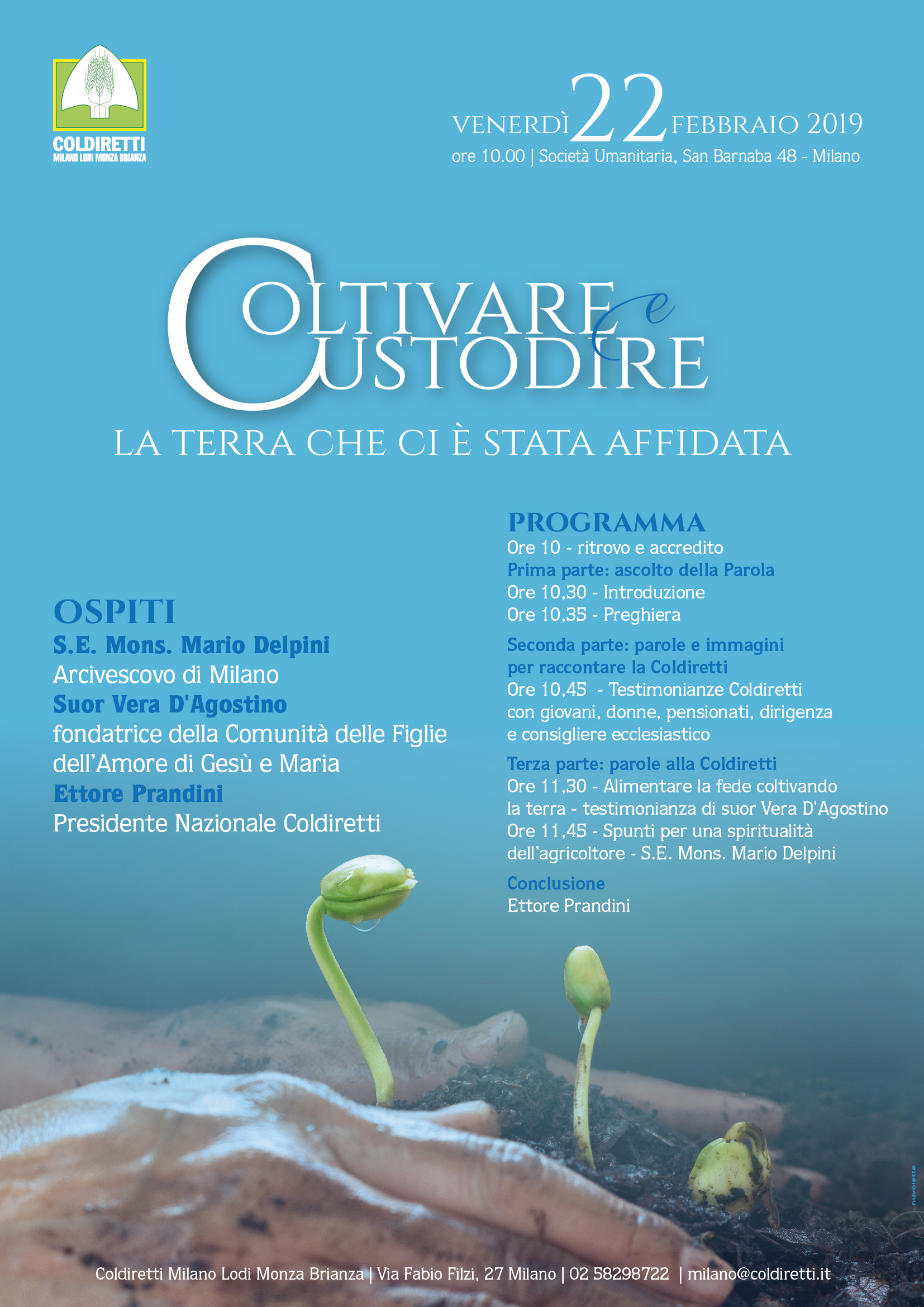 Il grido della terra e quello dei poveri da ascoltare e da raccogliere. La terra da amare, da coltivare e da rispettare. Queste le parole che tornano più frequentemente nel convegno promosso alla Società Umanitaria dalla Coldiretti Milano Lodi Monza Brianza, con l’intervento dell’Arcivescovo. «Coltivare e custodire la terra che ci è stata affidata», il titolo della mattinata di confronto, cui partecipano i direttori di realtà della Coldiretti Lombardia e tanti iscritti.