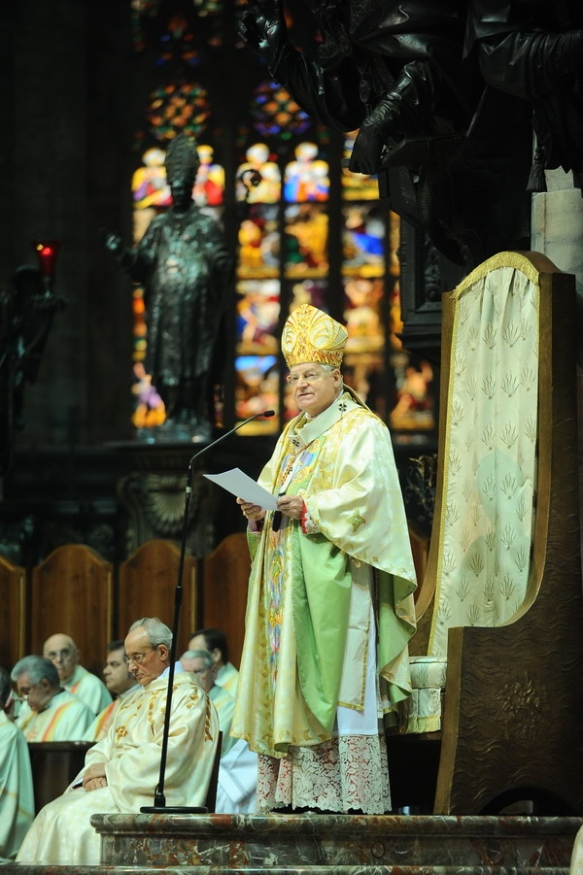 Questa sera, in Duomo, il cardinale Angelo Scola ha presieduto un Rosario meditato, celebrazione pensata come ulteriore tappa del cammino di preparazione al VII Incontro Mondiale delle Famiglie. Erano presenti diverse migliaia di fedeli, oltre a quelli che hanno partecipato alla celebrazione seguendo le dirette radio, tv e web. Il senso della serata era infatti quello di una celebrazione comunitaria in cui il popolo di Dio che è in Milano, guidato dal suo Arcivescovo, esprimesse la fede grata nel Signore che ha donato Maria come Madre e come modello di vita.