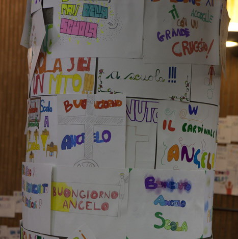 Ad accogliere l’Arcivescovo Angelo Scola all’ingresso del Leone XIII sono i tanti fogli appesi dagli alunni della scuola con espressioni di benvenuto. La sala è carica di attesa e gremita fino all’ultimo posto da operatori e consiglieri pastorali (molti dei quali neo eletti), provenienti da tutte le parrocchie della città. Con questo incontro, ha spiegato il Cardinale, si è concluso il suo ingresso in diocesi, fatto di serate a tema e visite alle sette Zone pastorali: «Tutti incontri preziosi e importanti che in breve tempo mi hanno permesso di fare una full immersion». Approfitta per ringraziare il Vicario generale, i Vicari episcopali e di Zona, come pure i decani, i preti e i responsabili degli uffici «che hanno speso tempo ed energie».