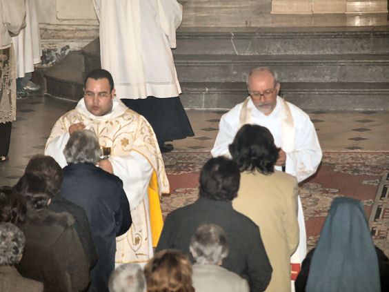 A questo punto, mentre il sacerdote comunica ai santi doni, coloro che hanno deciso di accostarsi alla comunione lasciano il loro posto e si mettono in fila per incamminarsi verso l’altare o verso il luogo dove riceveranno la comunione: «Il rito prevede che il fedele non riceva l’eucaristia al posto in cui si trova, ma egli è chiamato a lasciare il suo posto e camminare verso l’altare» (Boselli). Questo gesto, funzionale per raggiungere in modo ordinato il luogo della distribuzione eucaristica, racchiude in sé anche una pluralità di significati spirituali che meritano di essere portati alla luce.