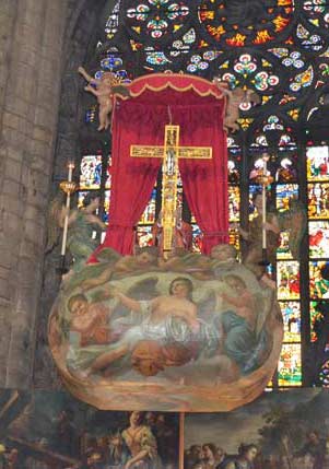 La «Nivola» è una sorta di ascensore il cui aspetto ricorda quello di una grossa nube che si alza verso il cielo. Ecco perché tale congegno è stato ribattezzato dal popolo con il termine dialettale di nivola (nuvola, per l’appunto), nome che ormai, col passare dei secoli, è diventato ufficiale. Sulla «Nivola» prende posto l’Arcivescovo per salire fino al reliquiario, prelevare il Santo Chiodo e portarlo a terra tra il canto delle litanie dei santi e la lettura del Vangelo della Passione del Signore. La preziosa reliquia della Passione del Signore viene prelevata dalla sua custodia posta sulla volta del presbiterio del Duomo e rimane esposta sull’altare maggiore alla venerazione dei fedeli per tre giorni, secondo una consuetudine che risale a San Carlo Borromeo, il sabato, la domenica e il lunedì più vicini alla festa liturgica dell’Esaltazione della S. Croce che ricorre il 14 settembre.
