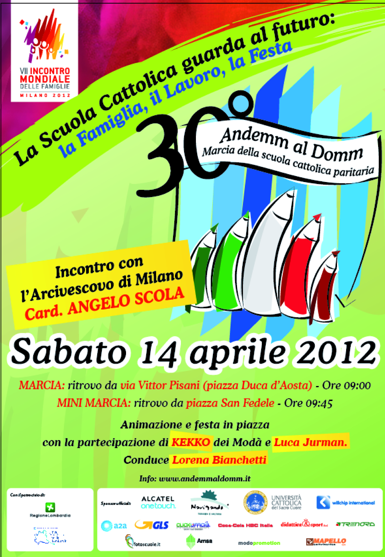 Organizzata dalla Pastorale scolastica e dall’associazione “Marcia della scuola cattolica”, la manifestazione, giunta alla sua trentesima edizione e quest’anno dedicata al tema “La scuola cattolica guarda al futuro: la famiglia, il lavoro e la festa”, si terrà sabato 14 aprile. Il ritrovo è alle 9 in via Vittor Pisani (piazza Duca D’Aosta). È prevista anche una mini marcia per i piccoli della scuola dell’infanzia da piazza San Fedele alle 9.45. Per gli studenti delle scuole secondarie di secondo grado il ritrovo è alle 8.30/9 presso i chiostri dell’Università Cattolica del Sacro Cuore (largo Gemelli, 1). Per loro è in programma una staffetta gigante a 5 concorrenti: maschile e femminile. È attesa la partecipazione di 20 scuole superiori e di circa 200 alunni. Gli studenti delle scuole primarie e secondarie di primo grado si uniranno poi agli scolari più piccoli, insieme a dirigenti scolastici, insegnanti e genitori, in piazza Duomo, dove è previsto l’intervento dell’Arcivescovo di Milano Angelo Scola. Prima dell’intervento del Cardinale, si svolgerà un momento di festa e animazione in piazza con la partecipazione di Kekko, il cantante dei Modà, e di Luca Jurman. Condurrà Lorena Bianchetti.