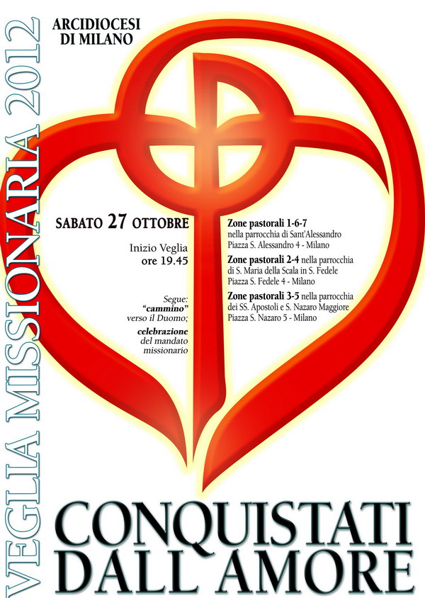 Sabato 27 ottobre la Chiesa ambrosiana celebrerà la Veglia missionaria. Quest’anno la Veglia ripropone l’esperienza di Paolo e di tanti discepoli che, “Conquistati dall’amore” di Gesù – come sottolinea il titolo della Veglia -, sono diventati suoi annunciatori. E durante la Veglia la Diocesi invierà altri testimoni del Vangelo perché, con la vita e la parola, possano comunicare lo stesso Amore che hanno incontrato.