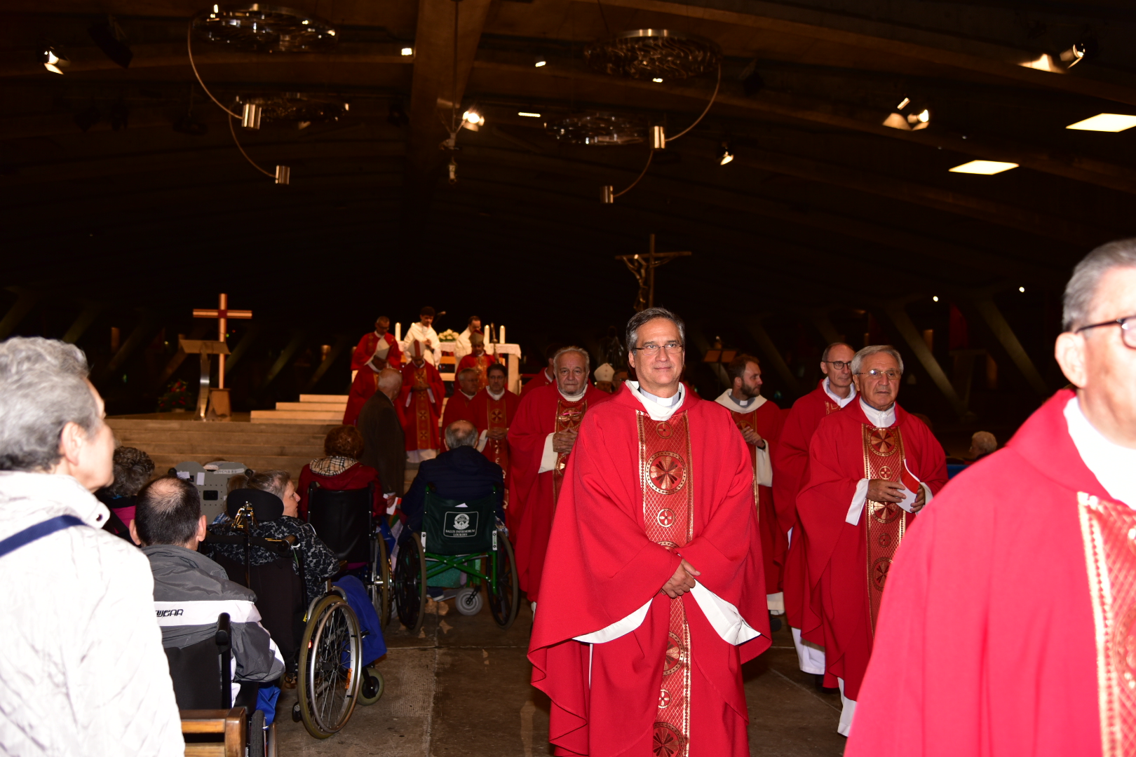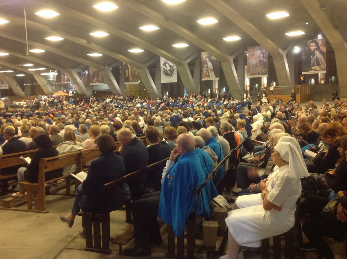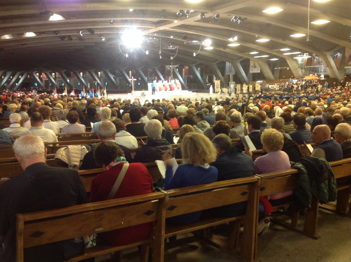 Si affolla in fretta, a sera, la Basilica sotterranea San Pio X, per la Celebrazione eucaristica all’inizio del pellegrinaggio degli ambrosiani a Lourdes.