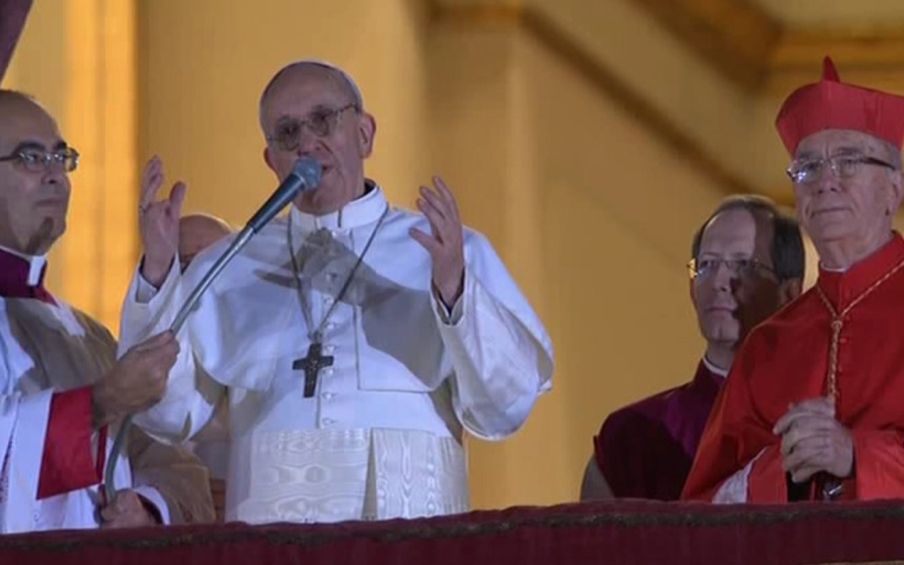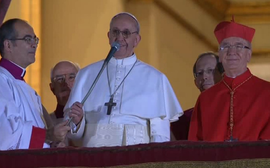 «Fratelli e sorelle, buona sera. Voi sapete che il dovere del Conclave era di dare un Vescovo a Roma. Sembra che i miei fratelli cardinali siano andati a prenderlo quasi alla fine del mondo, ma siamo qui. Vi ringrazio per l’accoglienza: la comunità diocesana di Roma ha il suo Vescovo. Grazie. Prima di tutto vorrei fare una preghiera per il nostro Vescovo emerito, Benedetto XVI: preghiamo tutti insieme per lui, perché il Signore lo benedica e la Madonna lo custodisca». Quindi ha iniziato a recitare, seguito da tutta la folla: Padre nostro…, Ave o Maria…, Gloria al Padre....