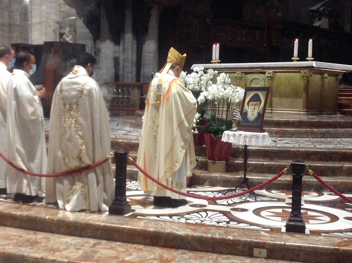 «Questa Celebrazione ha un aspetto molto speciale per due motivi, perché la celebriamo in Duomo, accolti e abbracciati dalla Chiesa madre di tutti – la Chiesa ambrosiana, nell’antico e solenne Rito ambrosiano – e perché non siamo radunati solo per pregare san Charbel per i nostri cari, ma anche per noi e per il nostro afflitto Paese».