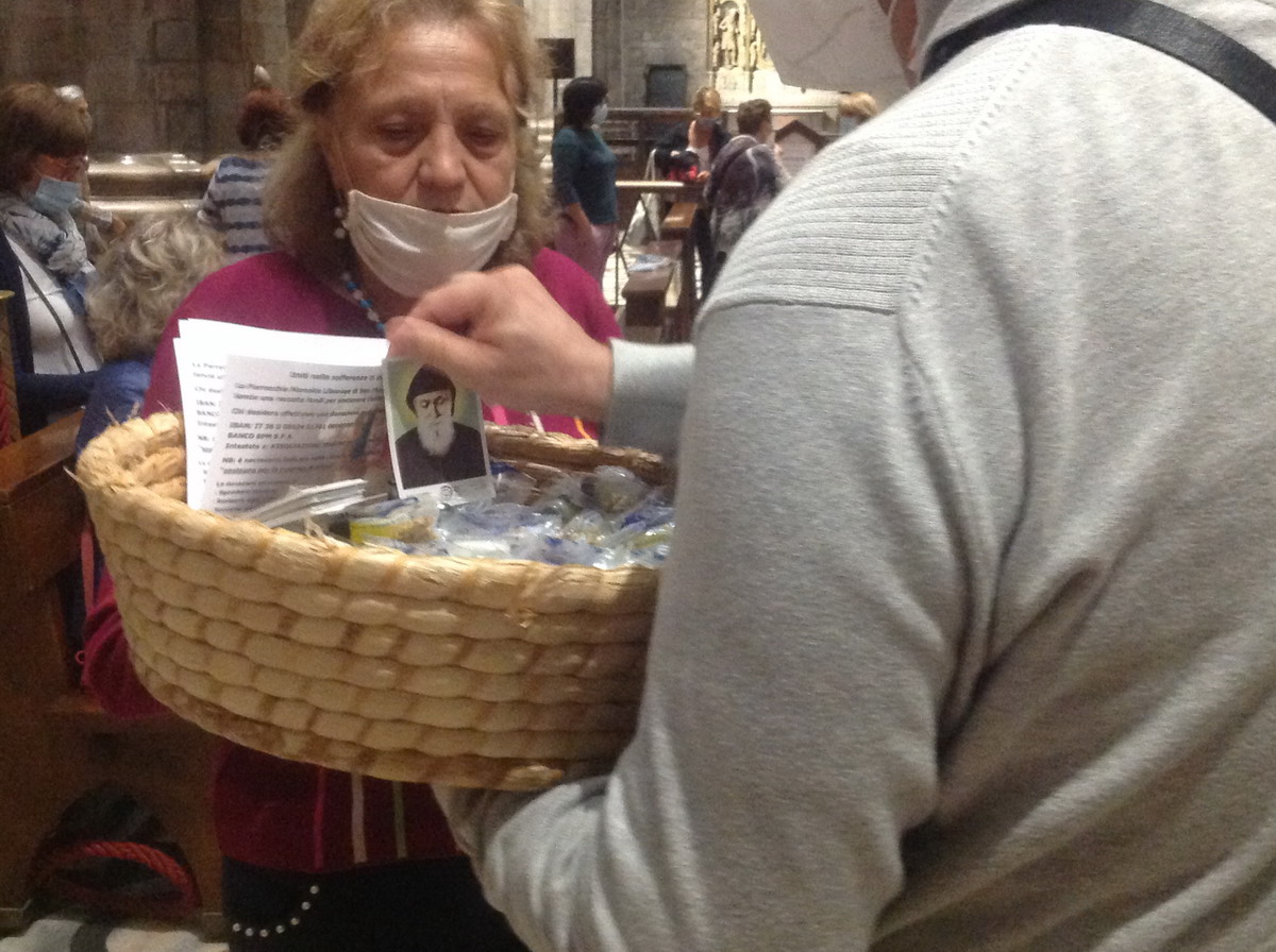 Un’immagine del monaco venerato e un piccolo contenitore di olio e di incenso (i suoi strumenti taumaturgici, secondo la tradizione) vengono consegnati, a conclusione, cosi come si usa nella festa liturgica del Santo.