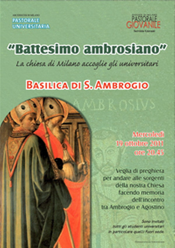 È il cosiddetto “Battesimo Ambrosiano”, la Veglia di preghiera in programma mercoledì 19 ottobre, alle 20.45, nella Basilica di Sant’Ambrogio, con la quale la Chiesa di Milano accoglie gli universitari. Un’occasione di raccoglimento per avviare il cammino annuale degli studenti, facendo memoria dell’incontro tra Sant’Ambrogio e Sant’Agostino e andando alle sorgenti della nostra Chiesa ambrosiana.