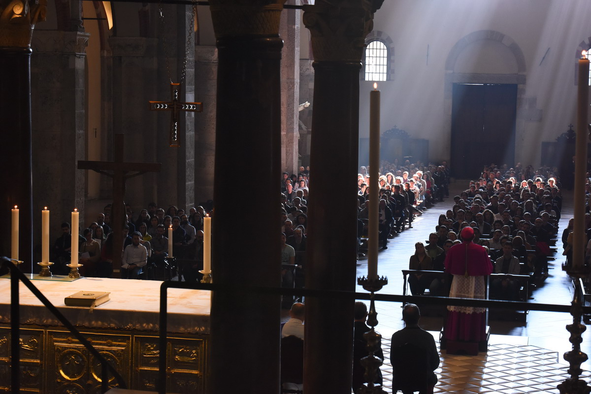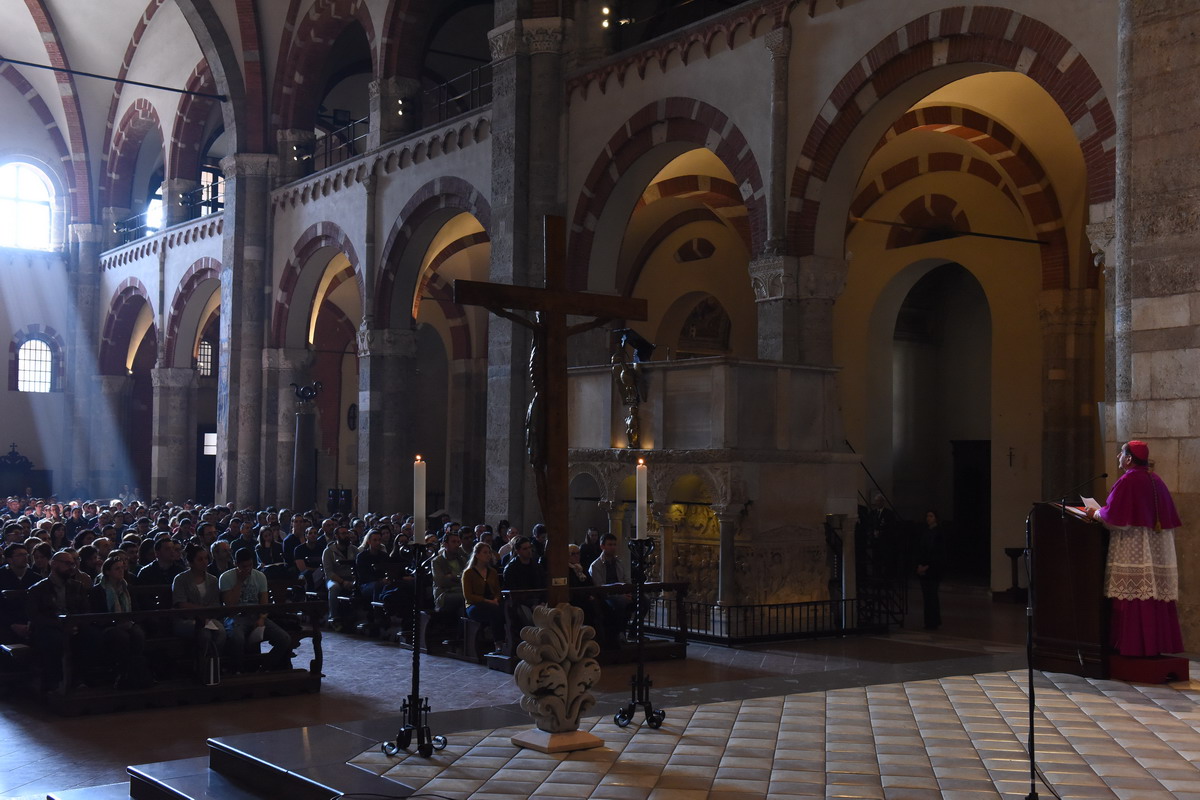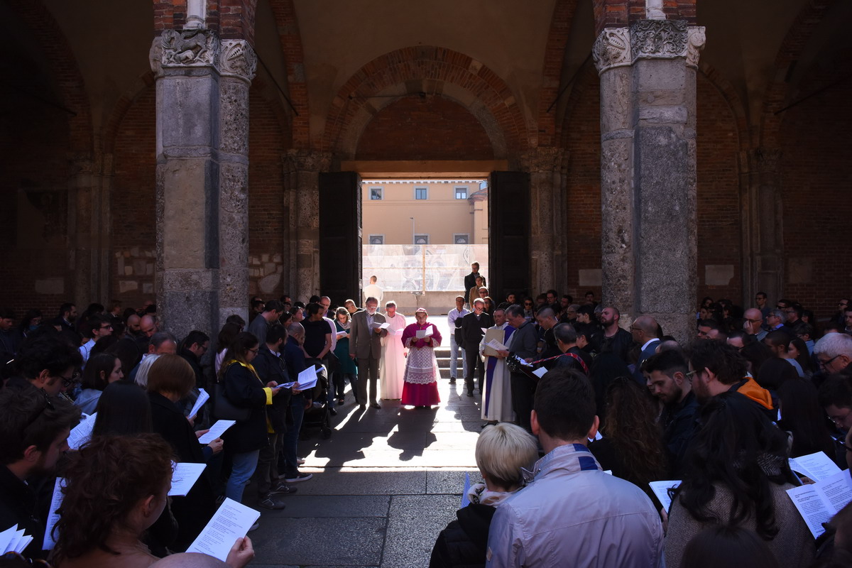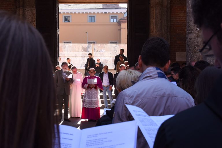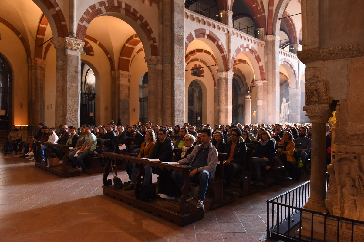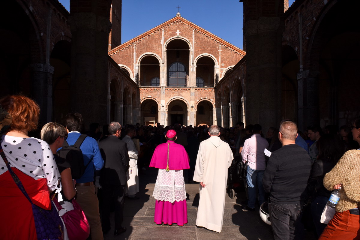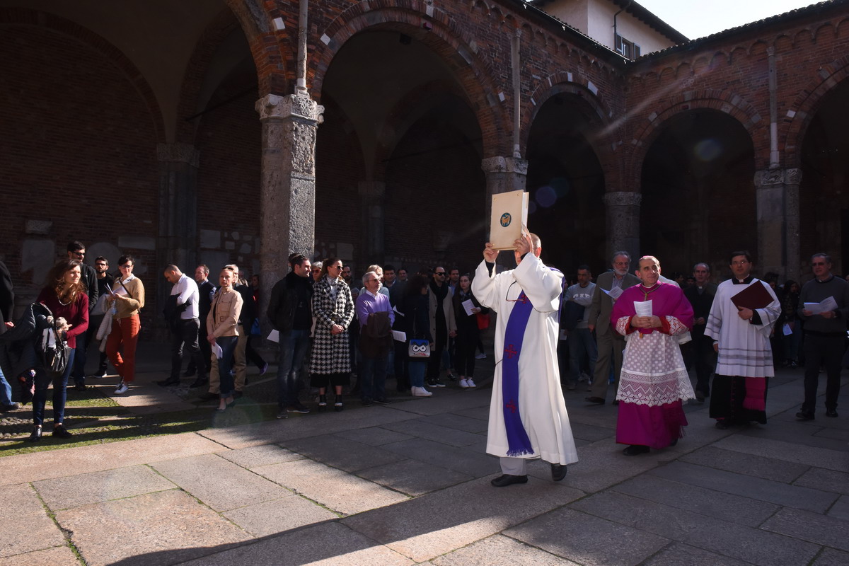 Il titolo della Lettera pastorale, “Cresce lungo il cammino il suo vigore”, con il versetto del Salmo 84, è lo stesso scelto per l’incontro che si apre nell’atrio di Ansperto, da cui i fidanzati entrano in processione nella basilica, seguendo il Libro dei Vangeli con l’Arcivescovo, il vicario episcopale di Settore, don Mario Antonelli e i responsabili del Servizio diocesano per la Famiglia, il diacono permanente, Luigi Magni, la moglie, Michela Tufigno e don Luciano Andriolo.