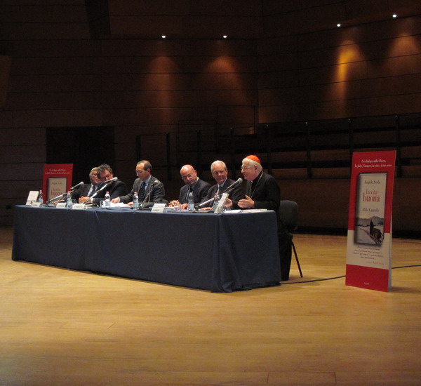 Al Teatro Dal Verme di Milano il giornalista e il Cardinale si sono ritrovati ieri sera davanti ad alcune riflessioni stimolate dalla lettura del volume La vita buona. Dialogo sulla chiesa, la fede, l’amore, la vita e il suo senso (Mondadori, 15 euro, 144 pagine), moderati da Roberto Righetto, caporedattore delle pagine culturali del quotidiano Avvenire e coordinatore del bimestrale Vita e pensiero dell’Università Cattolica di Milano. Hanno partecipato al dibattito il filosofo Silvano Petrosino, il fisico Ugo Amaldi e il sociologo Aldo Bonomi.