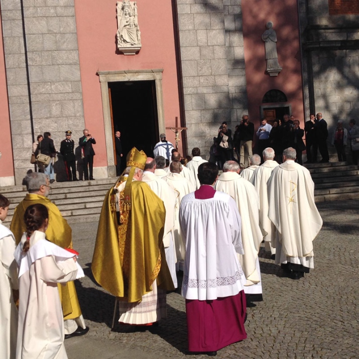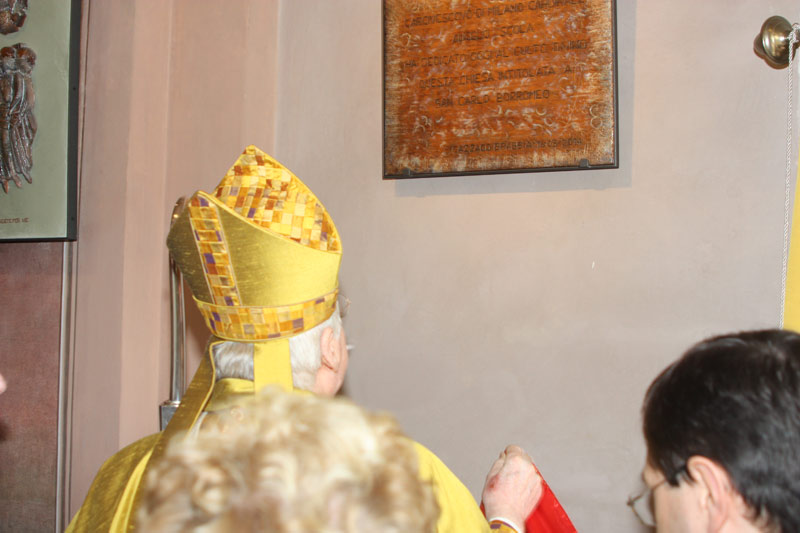 Poi, l’intensa liturgia di Dedicazione – resa ancora più solenne dalla non frequentissima deposizione delle reliquie dei santi: qui Simpliciano e i martiri Fedele e Carpoforo che vengono murate nell’altare –, le litanie dei Santi, la preghiera, l’unzione anche delle pareti della chiesa mentre si intona il canto antico, ambrosiano, del “Christe cunctorum” che ricorda la Dedicazione della Chiesa Cattedrale, l’incensazione e la copertura dell’altare con la raccolta parrocchia di San Carlo che si riempie di luce, simbolo della luce di Cristo portata al mondo attraverso la Chiesa.