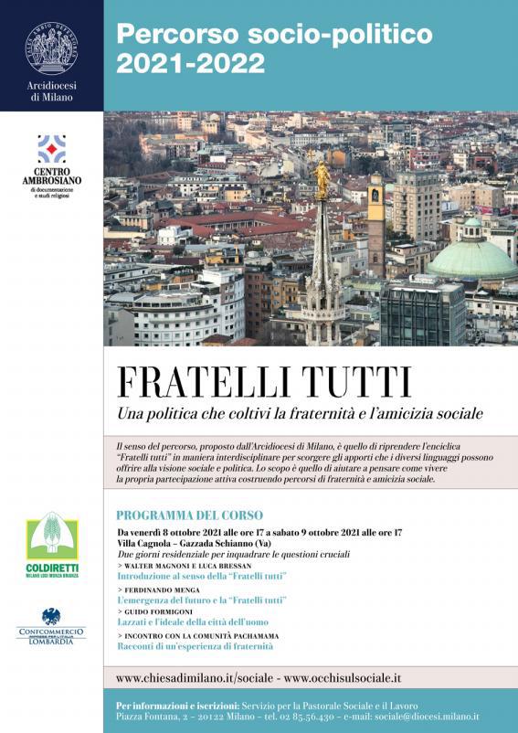 Si intitola «Fratelli tutti. Una politica che coltivi la fraternità e l’amicizia sociale» il percorso socio-politico 2021 proposto dalla Diocesi di Milano. Il senso è quello di riprendere l’enciclica Fratelli tutti in maniera interdisciplinare per scorgere gli apporti che i diversi linguaggi possono offrire alla visione sociale e politica. Lo scopo è quello di aiutare a pensare come vivere la propria partecipazione attiva costruendo percorsi di fraternità e amicizia sociale. Al percorso formativo possono partecipare giovani e adulti che desiderano pensare insieme la bellezza dell’impegno sociale e politico.