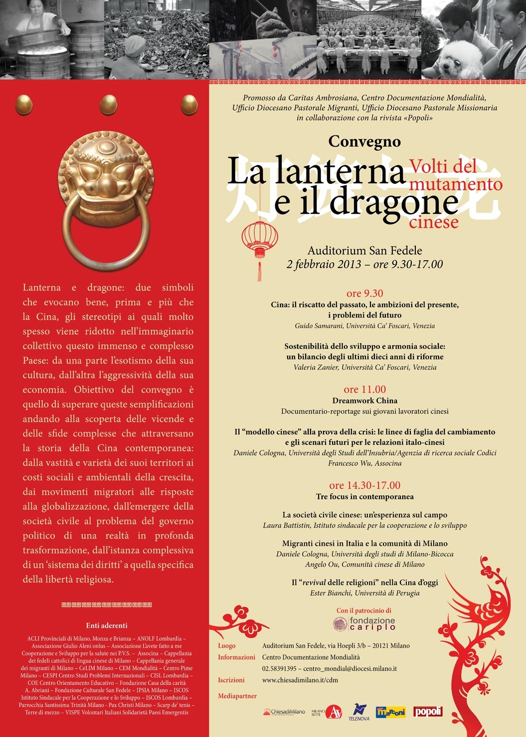 Di questo si parlerà nel convegno “La lanterna e il dragone. Volti del mutamento cinese”, promosso da Caritas Ambrosiana, Centro Documentazione Mondialità, Pastorale Migranti e Pastorale Missionaria, con la collaborazione di Popoli e la media partnership di www.chiesadimilano.it e “Milano Sette”, che avrà luogo sabato 2 febbraio, dalle 9.30 alle 17, all’Auditorium San Fedele (via Hoepli 3/b, Milano). L’incontro è rivolto a giovani e adulti attenti alla realtà internazionale e alle sue dinamiche.