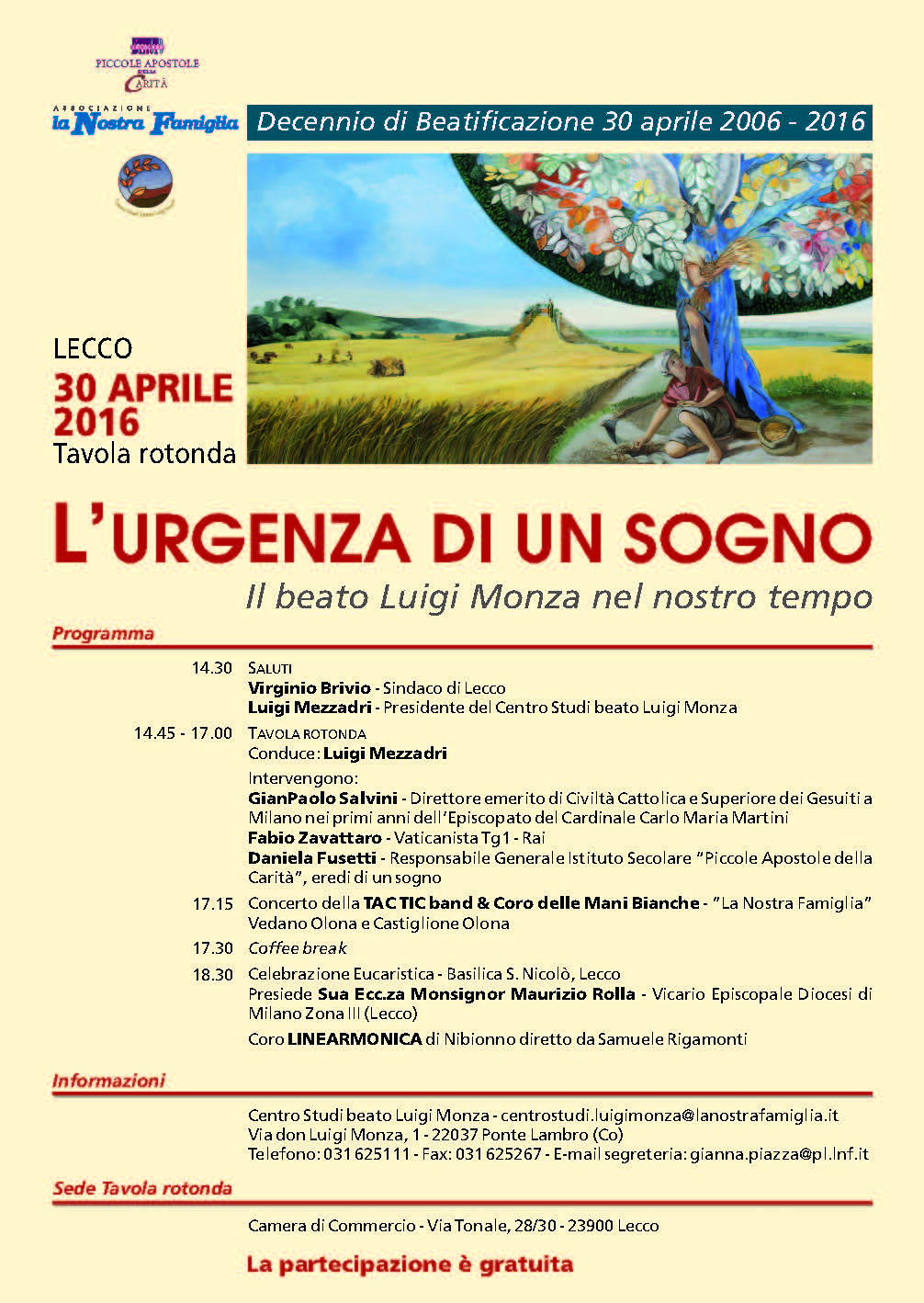 Per festeggiare i dieci anni dalla beatificazione del sacerdote ambrosiano, avvenuta nel 2006 in piazza Duomo a Milano, sabato 30 aprile, alle 14.30, presso la Camera di Commercio di Lecco, la sua “grande famiglia” organizza una tavola rotonda sul tema «L’urgenza di un sogno: il beato Luigi Monza nel nostro tempo». L’incontro sarà moderato da Luigi Mezzadri, presidente del “Centro studi beato Luigi Monza”, che spiega: «Ci sono due modi per festeggiare un anniversario. Il primo è celebrativo. Si mette il punto finale a un evento, quasi a chiuderlo in un archivio o, peggio, in una tomba. È la festa dei reduci, di quelli che si trovano per ricordare il passato e chi non c’è più. In questo modo si guarda al passato, al come eravamo. Il secondo è progettuale. Non si pensa tanto a ricordare il passato, ma ci si protende sul domani. Ci si prepara a nuove sfide e pertanto si guarda oltre gli ostacoli. Mentre procede la gara della vita, sappiamo che dovremo alzare le asticelle. Ma non dobbiamo lasciarci vincere dalla paura e pensare che altri appuntamenti ci aspettano; è continuare ad avere un sogno che mette al progetto le ali».