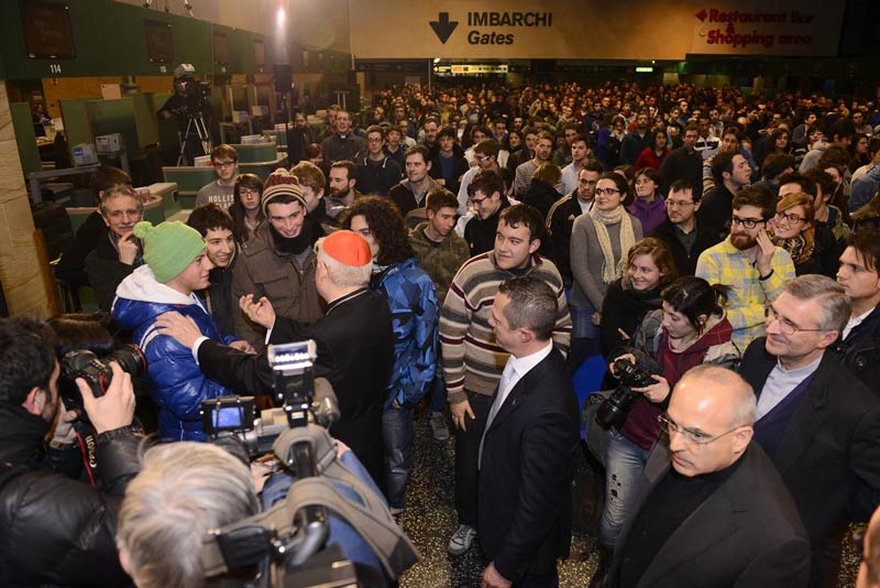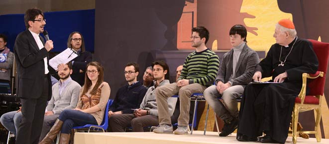 L’incertezza che attraversa la vita giovanile e la certezza che è il Signore, «roccia a cui aggrapparsi», «relazione costitutiva» sulla quale costruire una vita aperta agli altri a 360°, al «noi e al futuro». E, poi, la dimensione del dono, della gratuità, e quella domanda radicale sul dolore fisico e morale che chiede una risposta non facile: fidarsi e affidarsi al Dio vicino, con una fede che vince e convince. Il cardinale Scola arriva nella grande “Area gruppi” dell’aeroporto di Malpensa per il secondo Dialogo della fede con i giovani, che si affollano in oltre 1100 per un incontro che diviene scambio di idee, di interrogativi ed esperienze: insomma quel «giocarsi in prima persona» che «è cifra lo dice più volte l’Arcivescovo – della vera testimonianza».