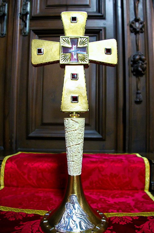 Realizzato in argento dorato con granati e cristallo di rocca dall’orafo milanese Pino Creperio, il fusto del reliquario è composto da un nodo d’avorio sul quale sono intagliate le stazioni della Via Crucis; sulla base dello stesso sono raffigurati la Deposizione ed i simboli dei Quattro Evangelisti.