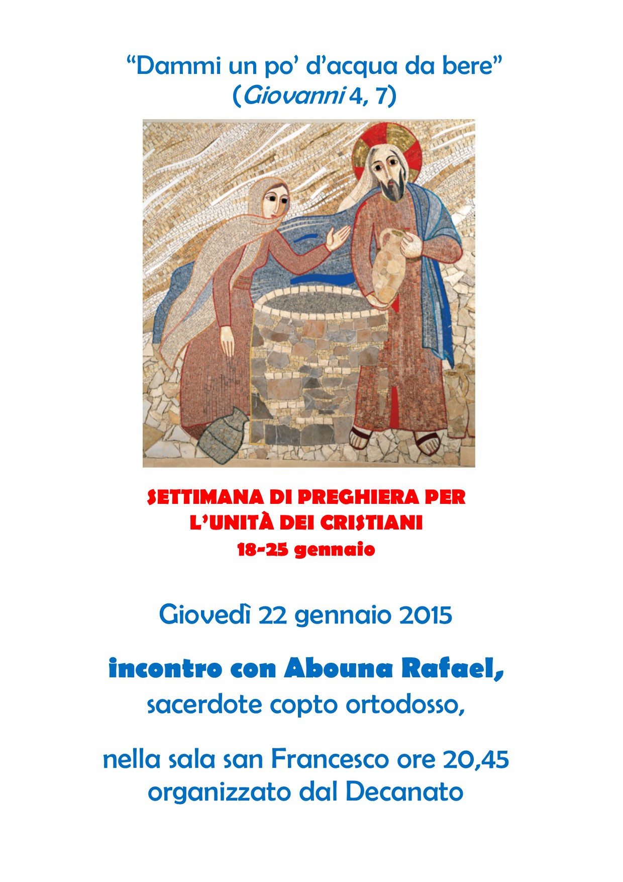 «Il testo presenta l’importanza per ciascuno di noi di conoscere e comprendere la propria identità, cosicché l’identità dell’altro non sia vista come una minaccia. Se non ci sentiremo minacciati, saremo in grado di sperimentare la complementarietà dell’altro. Nessuna persona, nessuna cultura da sola sono sufficienti!», si legge nel libretto-guida della Settimana. Il titolo Dammi un po’ d’acqua da bere implica un impegno etico che riconosca il bisogno gli uni degli altri per realizzare la missione della Chiesa. «Ci spinge a cambiare il nostro atteggiamento, ad impegnarci nel cercare l’unità nella nostra diversità, aprendoci ad una varietà di forme di preghiera e di spiritualità cristiana». Il testo-guida offre anche le letture per le liturgie quotidiane degli otto giorni della Settimana e suggerisce due domande di fondo: qual è la strada verso l’unità che assicura il dovuto rispetto della nostra diversità? Quale il cammino da intraprendere perché il mondo possa bere alla sorgente della vita, Gesù Cristo?
