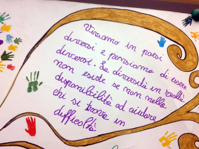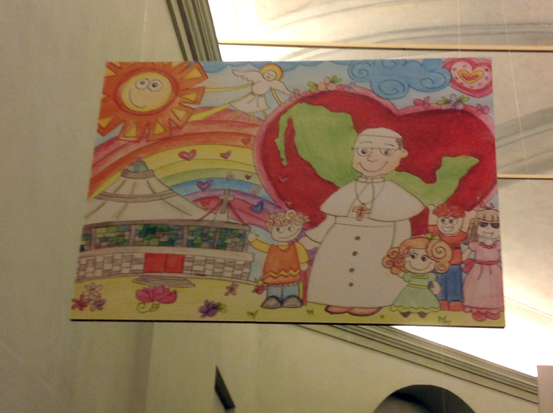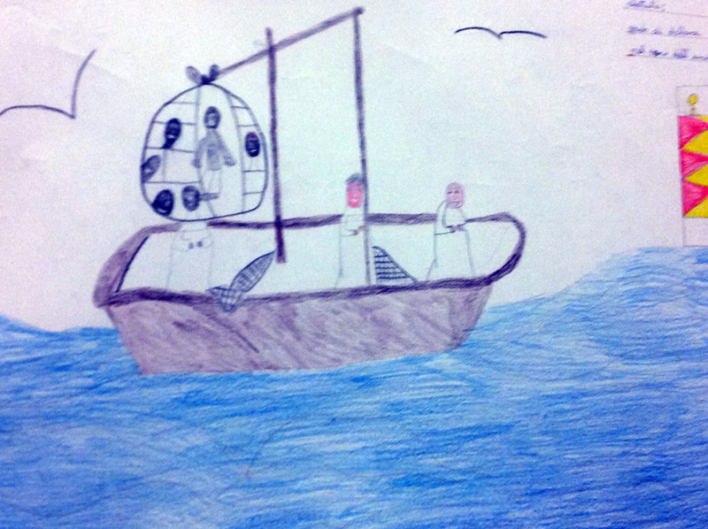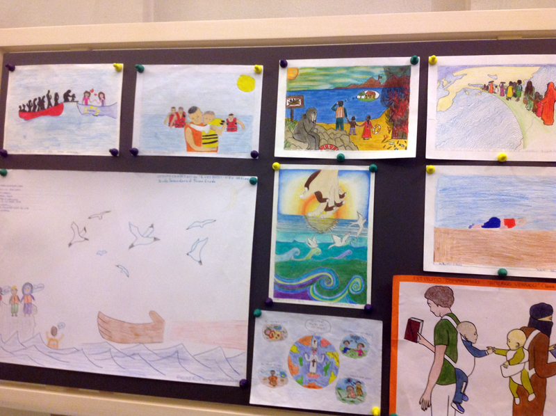«Viviamo in Paesi diversi e pensiamo di essere diversi. La diversità in realtà non esiste, se non nella disponibilità ad aiutare chi si trova in difficoltà». E ancora, una scrittura infantile, accanto al disegno di un barcone con una sorta di rete da cui emergono volti di colore ripescati dal mare, aggiunge: «Sono una goccia nel mare umano sconfinato, una goccia confusa, sbattuta: grido di dolore nel coro dell’universo». Poi tanti altri disegni, magari buffi e allegri, come quello di un viso sorridente del Papa tra un grande cuore e il sole o, magari, più nascostamente dolorosi, come quello che rappresenta un’Africa divisa a metà tra il deserto e un mare azzurrissimo attraversato da imbarcazioni cariche di donne e uomini.