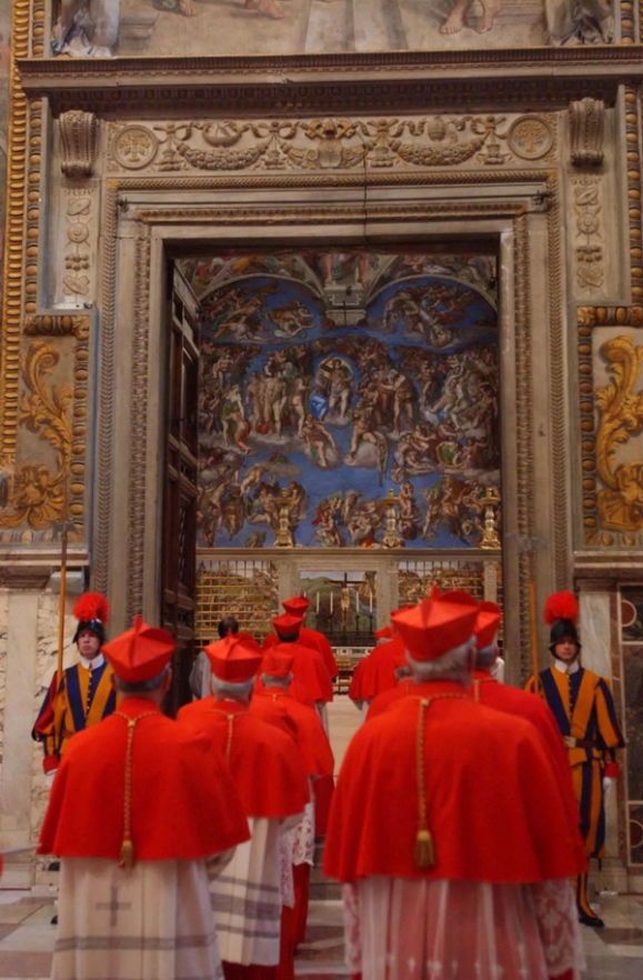 Conclave: si intende in materia canonica sia il luogo chiuso dove i cardinali elettori si riuniscono per eleggere il Papa, sia l’assemblea fisica stessa dei cardinali riuniti e rinchiusi per l’elezione. Dalla fine della sua edificazione nel XV secolo la Cappella Sistina è il luogo deputato al Conclave.