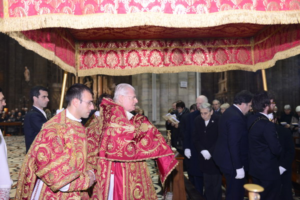 Scola ha anche sottolineato come l’Ultima Cena non sia stata «la ripetizione rituale della Pasqua ebraica, e nemmeno una sua correzione, ma la Pasqua propria di Gesù, la Sua singolare Pasqua. Egli la inaugura e realizza già durante quel pasto. In questa Santa Eucaristia noi la viviamo qui e ora. Questa nuova Pasqua ha conseguenze decisive per i Suoi e, perciò, per noi». San Paolo, nella seconda Lettura ricorda che «chi mangia e beve senza riconoscere il corpo mangia e beve la propria condanna». Dunque, sottolinea l’Arcivescovo, «il mistero dell’Eucaristia chiede con forza la nostra fede (cioè riconoscere il Corpo e il Sangue) perché diventiamo parte del corpo del Signore». Allora Scola ha richiamato la domanda del padre del fanciullo che accompagna la Lettera pastorale Alla scoperta del Dio vicino, «a cui raccomando di tornare nella nostra riflessione personale e di gruppo: “Credo; aiuta la mia incredulità”».