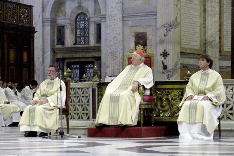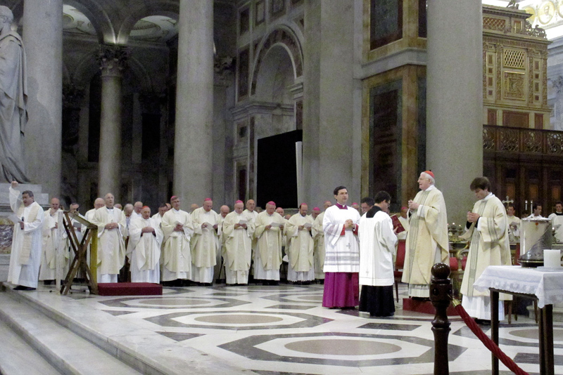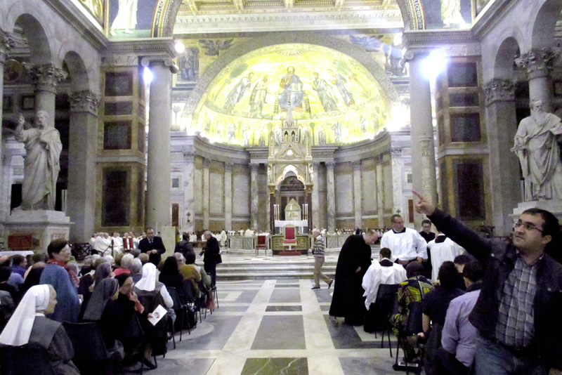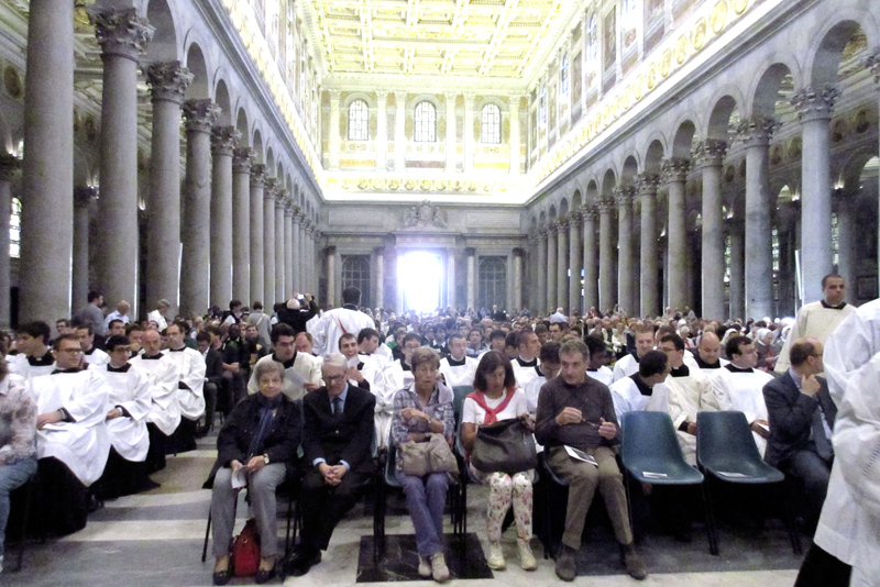 Il canto di ingresso accompagna la Processione con cui inizia la celebrazione eucaristica di ringraziamento per la Beatificazione di Paolo VI, in una basilica di San Paolo Fuori le Mura in cui siedono i pellegrini ambrosiani e bresciani, riuniti con i loro Pastori. Presiede il cardinale Scola, nella sua veste anche di Metropolita di Lombardia; concelebrano il cardinale Tettamanzi, il Vescovo di Brescia monsignor Luciano Monari, altri 15 Vescovi e circa 150 sacerdoti, alcuni dei quali – ordinati dall’Arcivescovo Montini – indossano con orgoglio il camice della loro prima Messa.