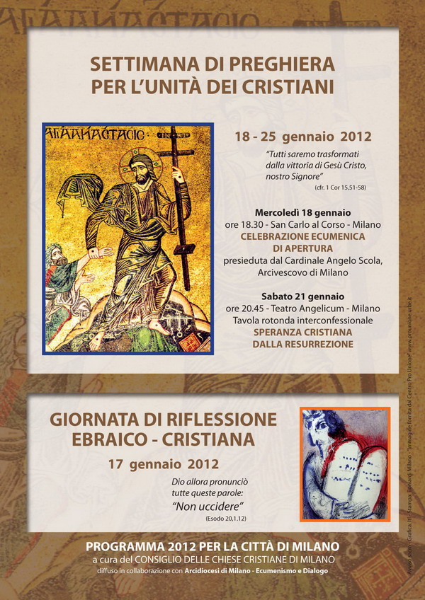L’apertura della Settimana, mercoledì 18 gennaio, è segnata dalla Celebrazione ecumenica della Parola nella basilica di San Carlo al Corso con la presenza del cardinale Angelo Scola (ore 18.30 – piazza S. Carlo). La Settimana poi continua giovedì 19, alle 12.35, per un breve tempo di silenzio e ascolto alla “Grotta di Elia” (nella chiesa di S. Gottardo al Palazzo Reale – via Pecorari); venerdi 20 gennaio l’appuntamento è alle ore 19 alla Chiesa Anglicana “All Saints Church” per la recita dei Vespri anglicani (via Solferino, 17); sabato 21, alle ore 20,45, presso l’Angelicum di piazza Sant’Angelo 2, ci sarà la Tavola rotonda sul tema “Speranza Cristiana dalla Resurrezione”, con il teologo valdese Paolo Ricca, il vescovo eletto di Novara, monsignor Franco Giulio Brambilla, e l’arciprete della chiesa ortodossa romena, Valdman Traian; lunedì 23 alle ore 18.30 ci si trova nella Chiesa Ortodossa greca per la recita dei Vespri bizantini (via Romolo Gessi, 19); e si conclude il mercoledì 25 (ore 20.45, alla Chiesa evangelica valdese di via Francesco Sforza 12) con una preghiera ecumenica accompagnata dalle corali di varie chiese e un momento di convivialità: “Canta, prega e condividi”. Domenica 22 si ripeterà in diverse chiese della città lo “scambio di ambone” tra predicatori di differenti tradizioni cristiane.