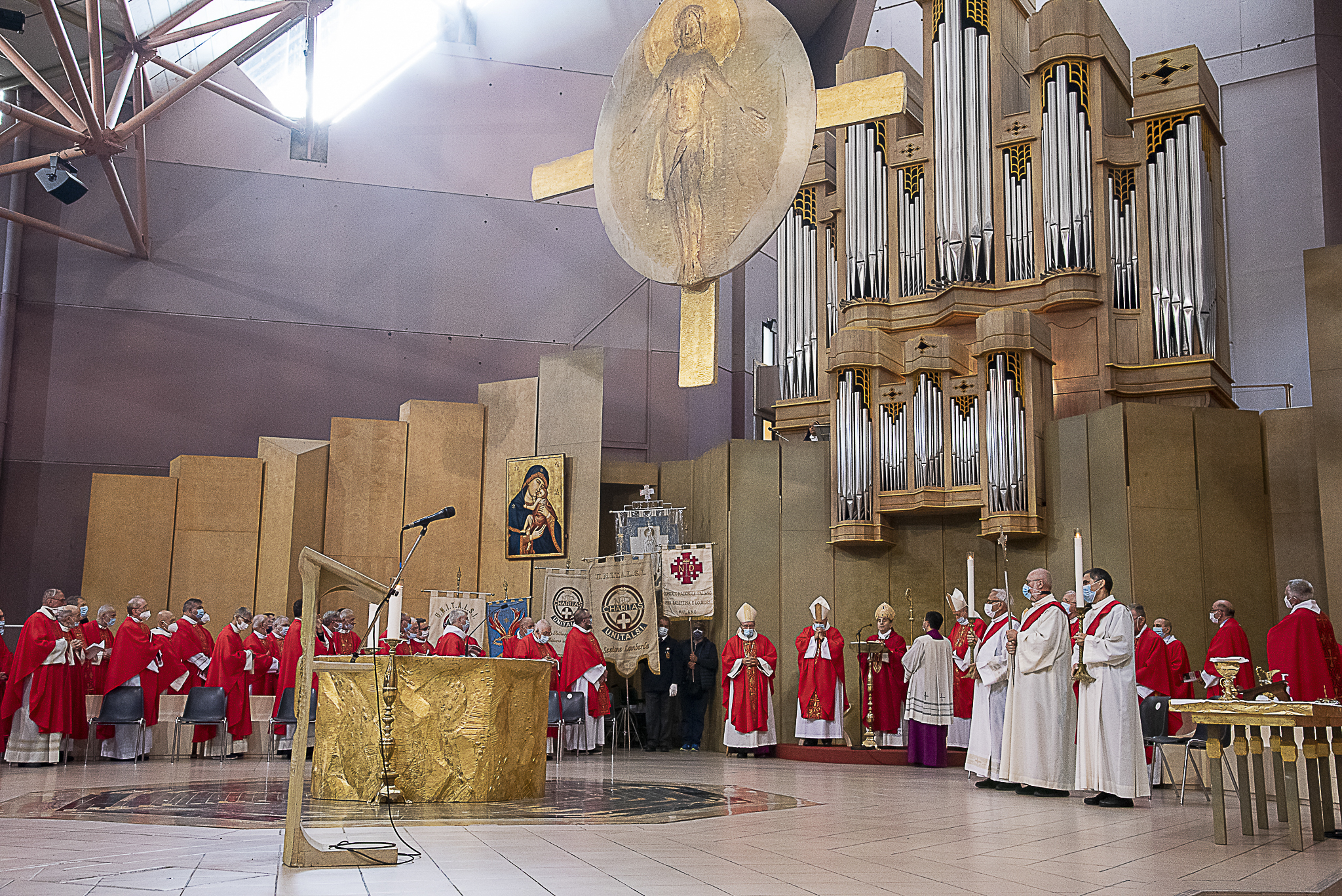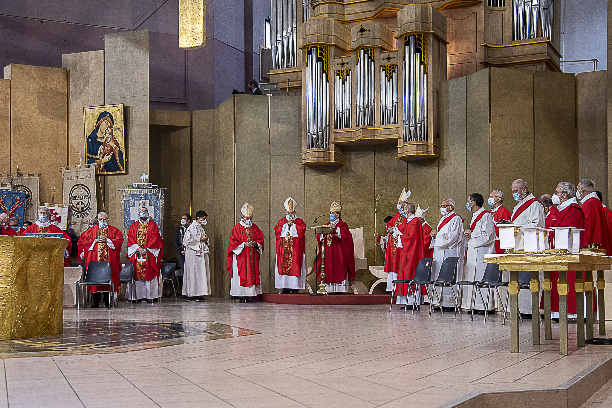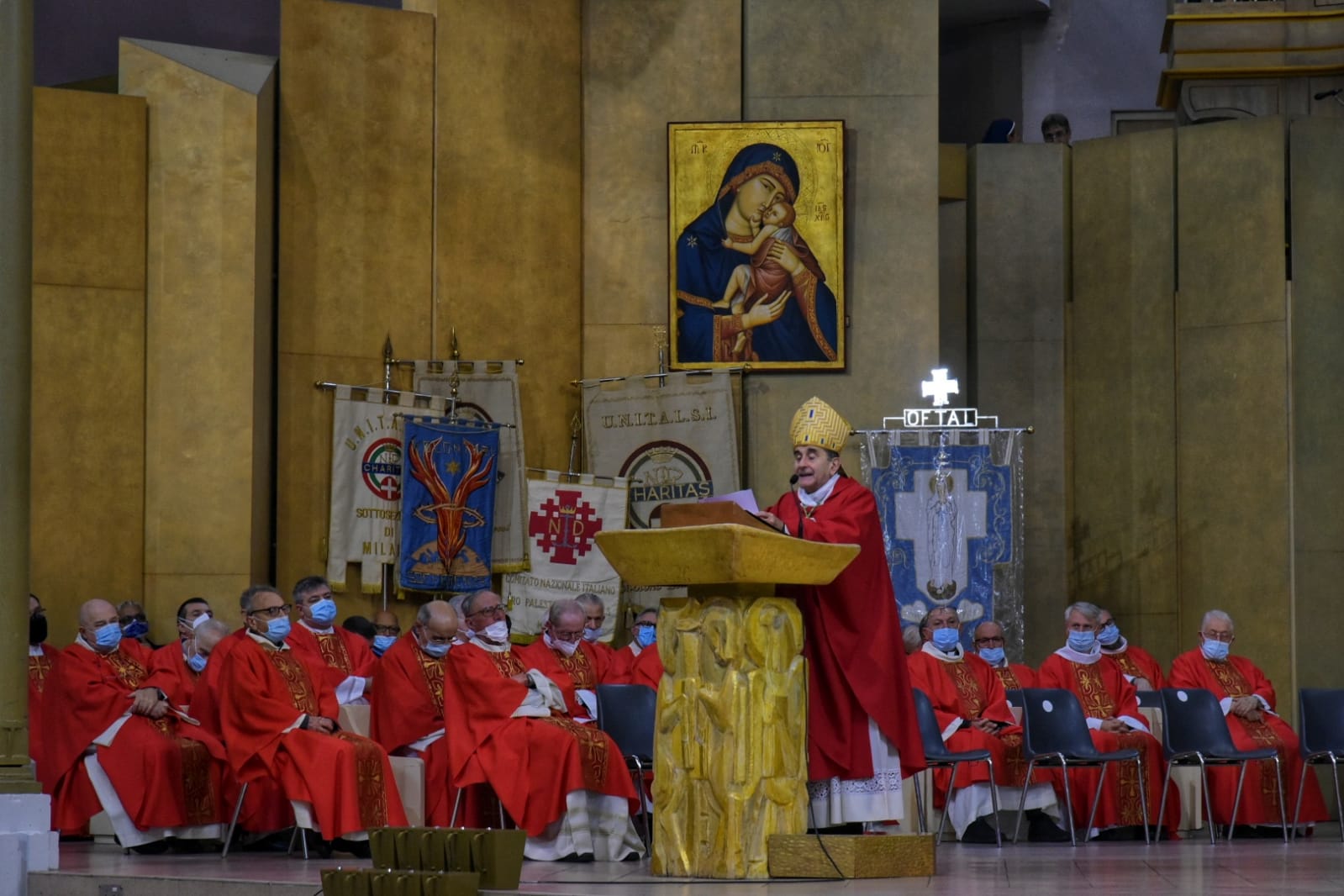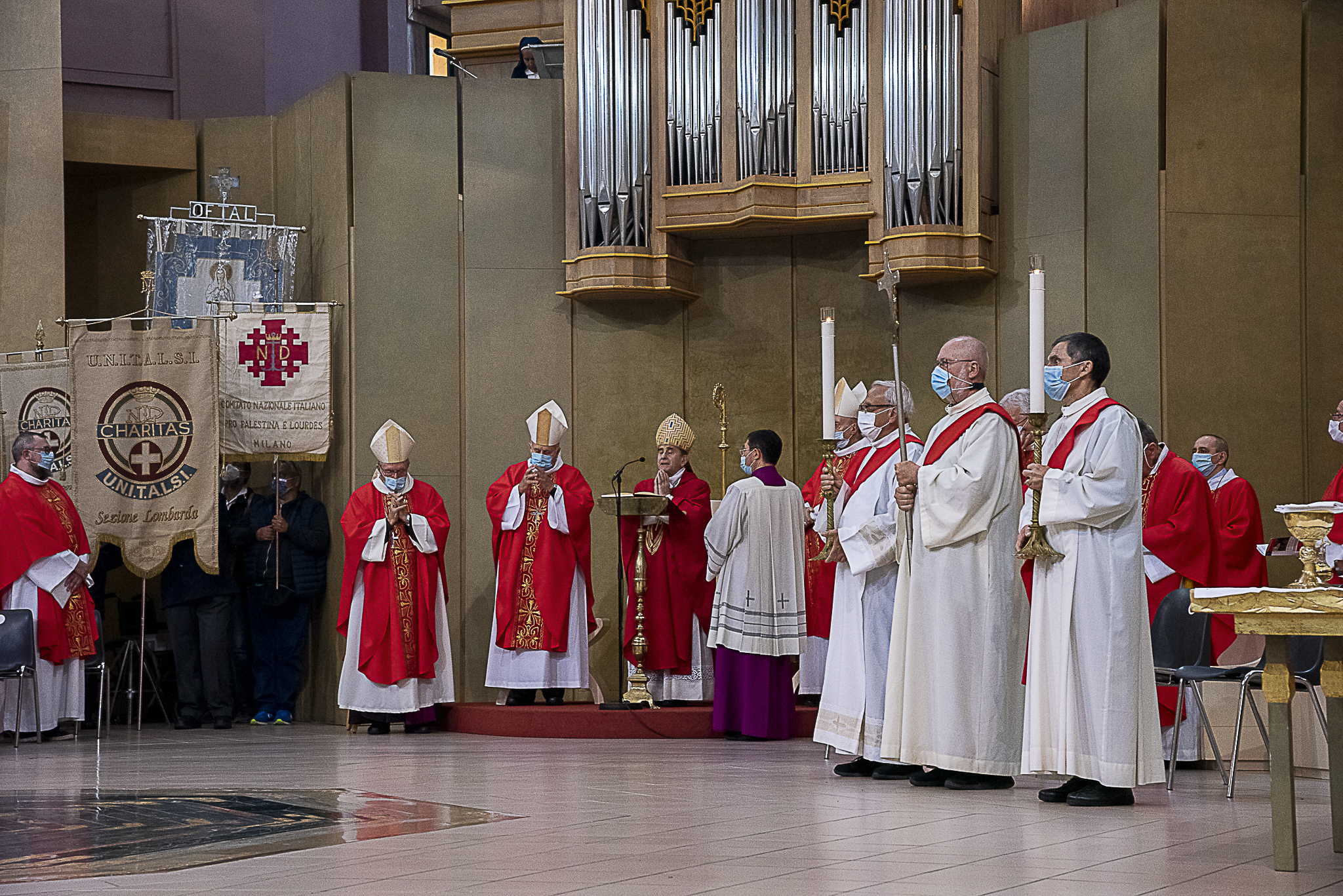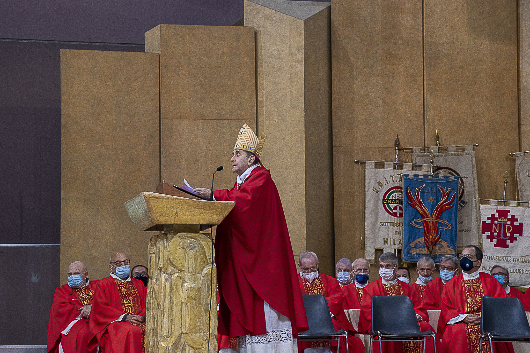 Gli stendardi, i gonfaloni delle associazioni, i quattro vescovi – i monsignori Giuseppe Merisi, Erminio De Scalzi, l’assistente nazionale Unitalsi monsignor Luigi Bressan e quello regionale lombardo monsignor Roberto Busti -, i 50 sacerdoti concelebranti: tutto parla di un ritorno, pur nella consapevolezza della sofferenza dei mesi passati. Tanto che, aprendo la Messa, l’Arcivescovo dice: «Sentiamo che ci ha chiamati qui Maria, ci ha chiamati qui il desiderio di dire che stiamo uscendo dalla pandemia che ci ha isolati, qui per le persone malate; ci ha chiamati il desiderio di pregare per tutti quelli che lo hanno chiesto, ci ha chiamati il Signore che vuole rivolgerci la sua parola che libera e annuncia la gioia di essere figli dì Dio».