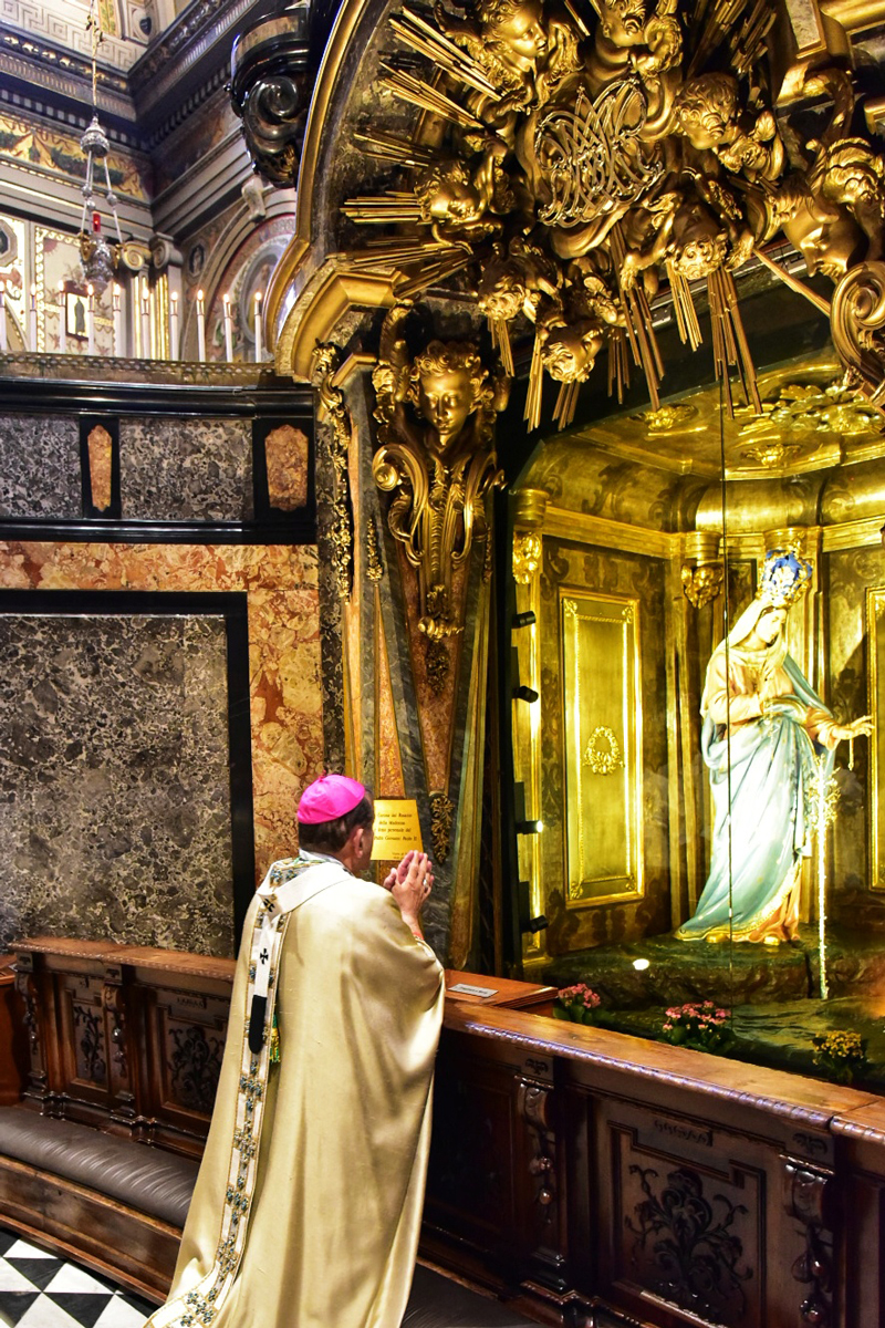 Monsignor Antonio Napolioni, vescovo di Cremona (Caravaggio è nel territorio della sua Diocesi) porge il saluto di benvenuto. Il canto del “Magnificat” annoda, come un filo d’oro della fede, la riflessione dell’Arcivescovo.