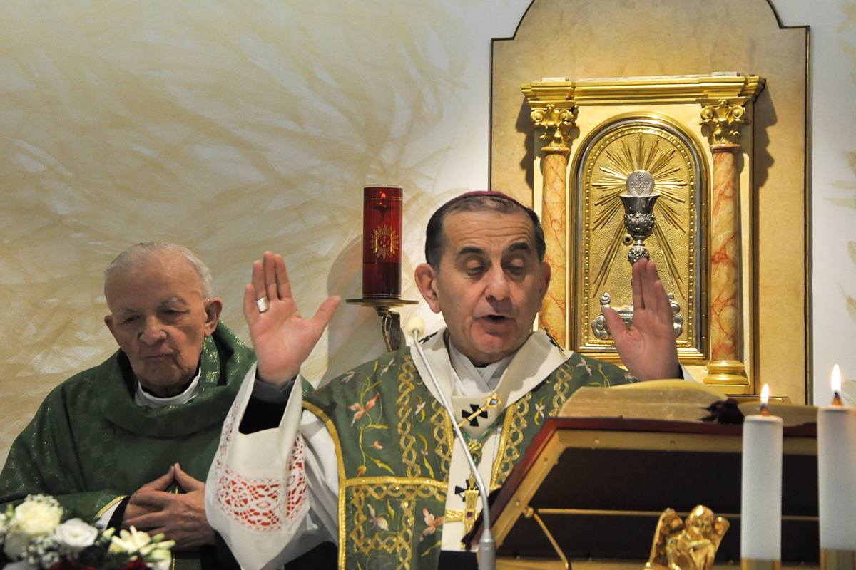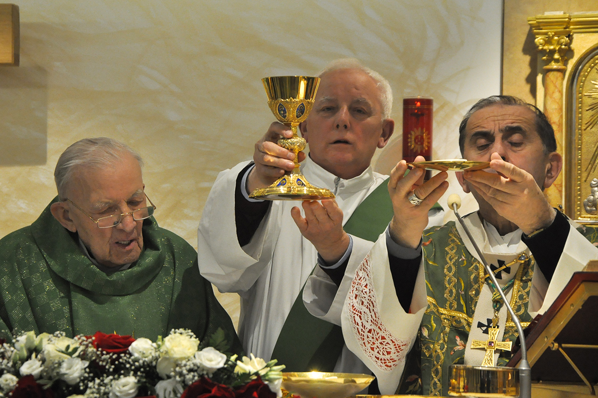 Celebrazione eucaristica nella cappellina dell'emittente. Il fondatore don Mario Galbiati ha ricevuto la Regola di vita della Comunità di Maria e un messaggio augurale di papa Francesco