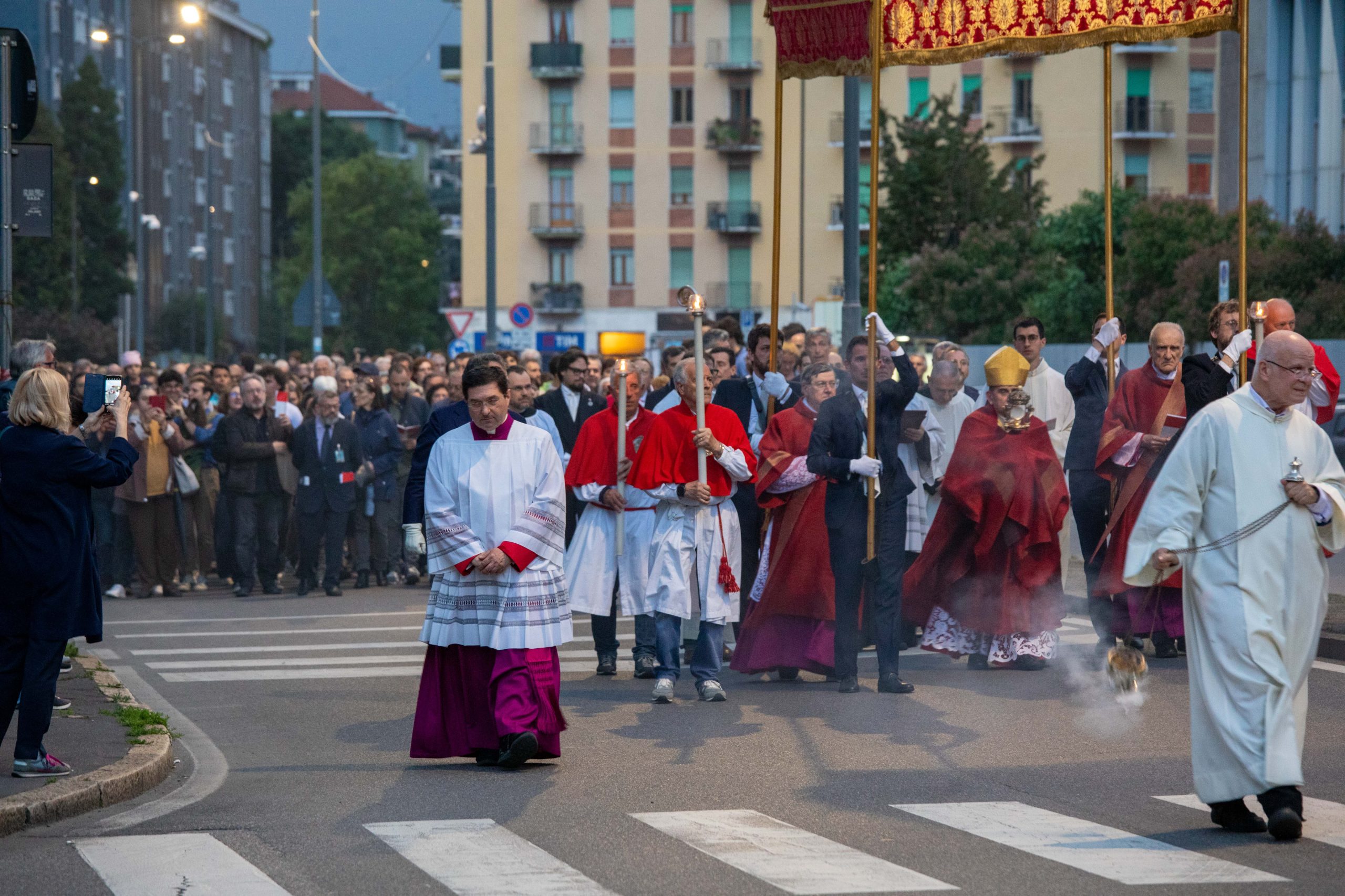 Invitate, come tradizione, le realtà che rappresentano la vita culturale, civile e associativa della metropoli con i Gonfaloni del Comune – rappresentato dalla vicesindaco Anna Scavuzzo -, della Città metropolitana (con il consigliere Marco Griguolo) e della Regione Lombardia e con gli stendardi dell’Università Cattolica del Sacro Cuore, di associazioni religiose, del volontariato, delle articolazioni ecclesiali quali l’Azione Cattolica. Tutti insieme: fedeli di ogni età, dalle famiglie con bimbi piccoli agli anziani, la gente che si affaccia dai balconi o che si unisce alla processione con chi getta petali di rose al passaggio del Santissimo Sacramento racchiuso nel tipico ostensorio ambrosiano.
