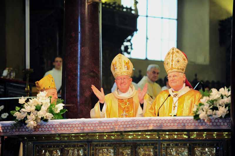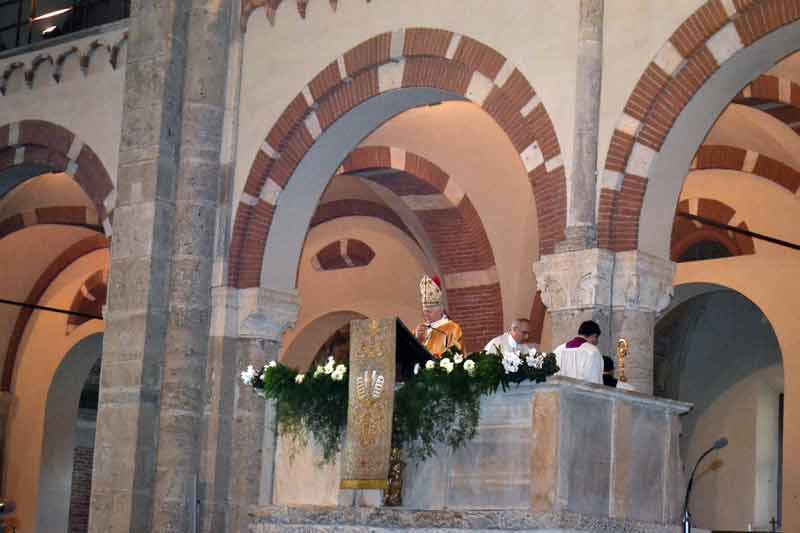 Dopo la comunione l’Arcivescovo ha ripreso nuovamente la parola comunicando a tutti due importanti notizie: la presenza dell’arcivescovo di Belgrado, monsignor Hocevar, giunto a Milano per testimoniare anche lui l’importanza dell’editto di Costantino e per elogiare pubblicamente don Adelio Dell’Oro, prete ambrosiano che oggi è stato nominato vescovo di Atyrau, in Kazakistan. L’arcivescovo infine è sceso in cripta per venerare le spoglie di sant’Ambrogio e dei santi martiri Gervaso e Protaso.