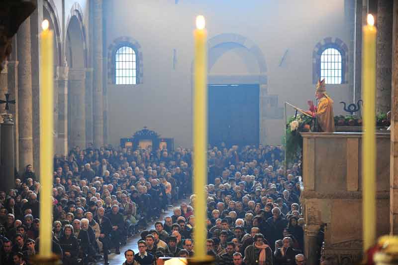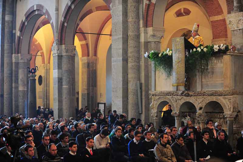 «Dio fece posare sul suo capo… la sua alleanza: la Liturgia odierna onora Ambrogio con il bel brano tratto dal Libro del Siracid-. Ma come la grandezza del sommo sacerdote, così anche quella di Ambrogio, non si basa anzitutto sulle sue doti umane, culturali e sociali, ma sulla fedeltà all’Alleanza che Dio ha stabilito con lui. Fin dall’Antico Testamento l’Alleanza è la forma della reciproca appartenenza tra Dio e l’uomo. Essa ha nel nostro padre Ambrogio, generatore di un popolo di cui noi siamo gli eredi, un intramontabile paradigma». Con queste parole l’Arcivescovo Scola ha spiegato a tutti quale importante esempio di fede e di vita è il santo Ambrogio. Erano migliaia i fedeli che questa mattina hanno partecipato alla celebrazione eucaristica in onore di Sant’Ambrogio, patrono della Santa Chiesa Ambrosiana e della città di Milano. Vi erano inoltre tutti gli appartenenti alla comunità seminarista della diocesi, i vescovi e preti ambrosiani. Una cerimonia molto intensa in cui l’Arcivescovo ha voluto sottolineare il grande valore dell’appartenenza a Gesù Cristo, che non significa possesso, ma anzi è sinonimo di libertà. «Tuttavia è soprattutto Gesù, il Buon Pastore, a generare il Suo popolo, la Chiesa – ha proseguito -. In che modo? Lo abbiamo appena ascoltato: “Il buon pastore dà la propria vita per le pecore. Il mercenario abbandona le pecore e fugge perché non gli importa delle pecore”. Con queste parole il Santo Vangelo ci aiuta a comprendere che il rapporto tra il buon pastore ed il gregge non è di possesso, ma appunto di appartenenza. Apparteniamo a Gesù e questo ci fa liberi». Ogni persona, ogni istituzione secondo le parole dell’Arcivescovo dovrebbe fare esperienza quotidiana di quest’appartenenza per essere poi realmente libera. «Lo dovremmo essere, soprattutto, noi cristiani che, qui a Milano, fin dai tempi di Sant’Ambrogio, siamo stati educati a difendere e custodire la libertà di ogni singolo uomo e dell’intero popolo di Dio. Quando dunque, nello statuto del Comune di Milano, si stabilisce che sul gonfalone ufficiale della città sia rappresentato Ambrogio “vescovo eletto dal popolo”, ritroviamo semplicemente, ai giorni nostri, questa decisiva idea di libertà che affonda le sue radici nella storia della città», ha aggiunto il cardinal Scola, rivolgendosi direttamente a tutto il popolo ambrosiano. L’arcivescovo ha poi parlato del senso vero e profondo della vita: solo attraverso la conoscenza profonda di sé è possibile aprirsi al senso compiuto. «La grave situazione di travaglio antropologico e di crisi socio-economica in cui ci troviamo a vivere chiede a tutti i milanesi, in questa solennità, un impegno più deciso a “superare i confini della nostra misura”. Un impegno che si converta in un atteggiamento abituale, in una “virtù”, del nostro operare e vivere in società. Un respiro universale che ci fa costruttori della civiltà dell’amore». Concludendo l’omelia il cardinal Scola ha invitato tutti a rivolgersi a Maria Immacolata che verrà celebrata domattina in Duomo.