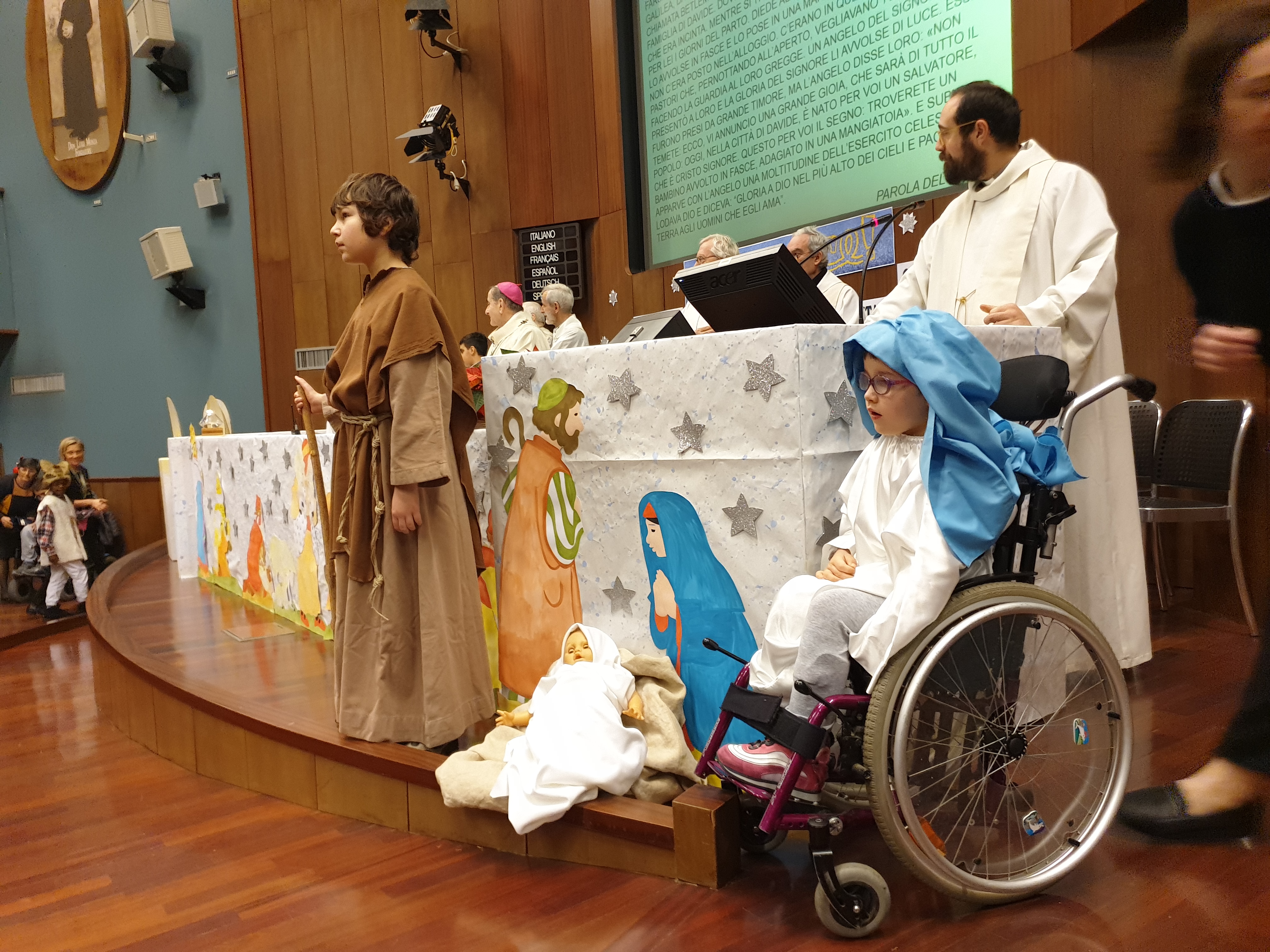 «Anche voi siete parte della moltitudine degli angeli, come l’angelo Serafino, che non sapeva cantare e allora svegliava i pastori con una carezza. O come l’angelo Poverino, che non sapeva giocare a pallone, scalare le montagne o usare il computer, ma indicava col sorriso l’arrivo di Gesù. O ancora come l’angelo Che è lì vicino, che indicava la strada e sapeva dire la parola giusta a chi era stanco… Ecco, questi sono gli angeli che io ho incontrato, che sono venuti dal cielo ma, ne sono convinto, sono qui tra noi».