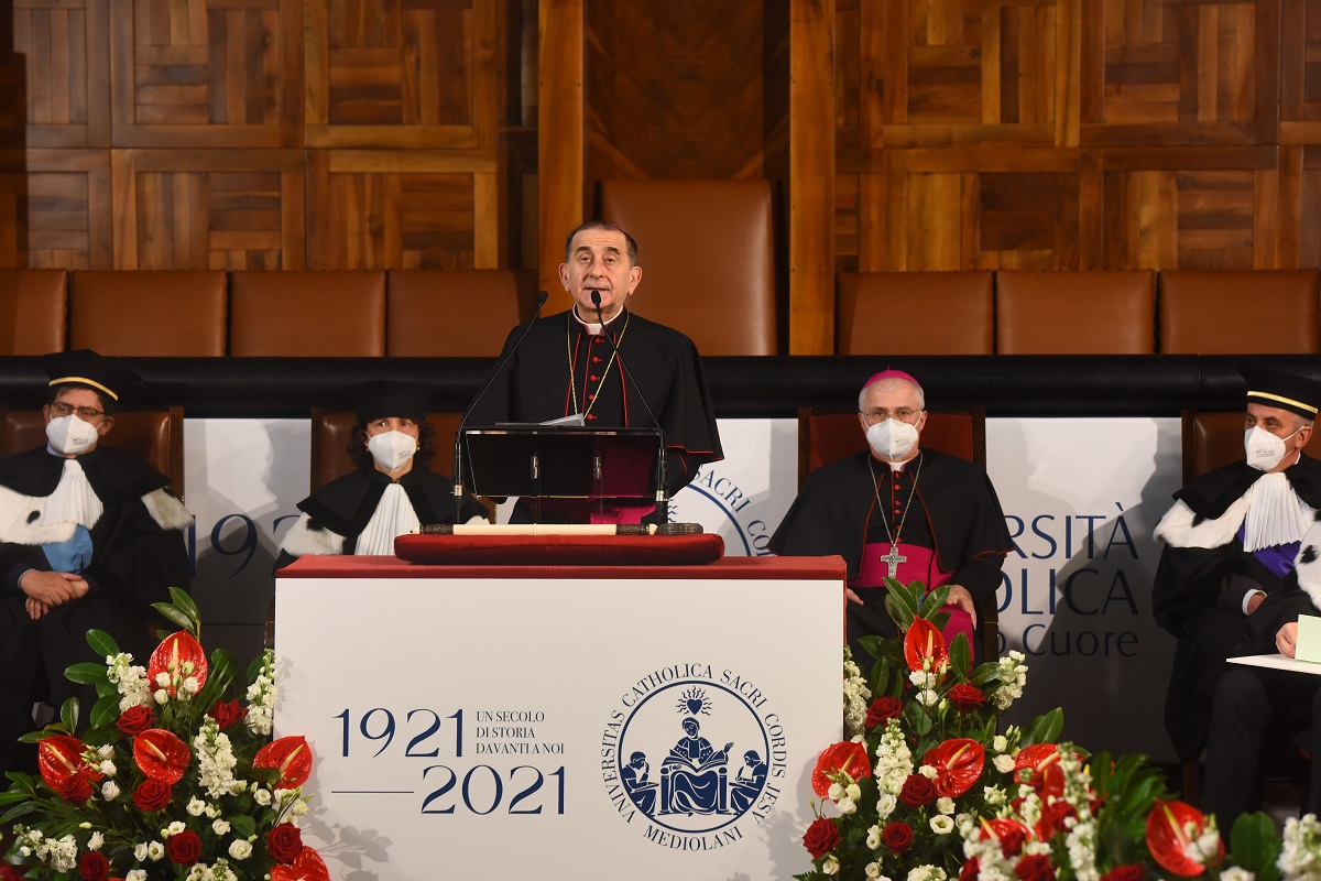 Dal significato del centenario e dal ruolo dell’ente fondatore, di cui è presidente, muove la riflessione dell’Arcivescovo: «Questi 100 anni, con l’evoluzione impressionante dell’Ateneo quanto a numeri di iscritti, assunzione di prestigio e a produzione scientifica, suggerisce che il “Toniolo” deve svolgere la sua funzione non tanto con un ruolo di vigilanza, ma con un ruolo di incoraggiamento e di coscienza critica».